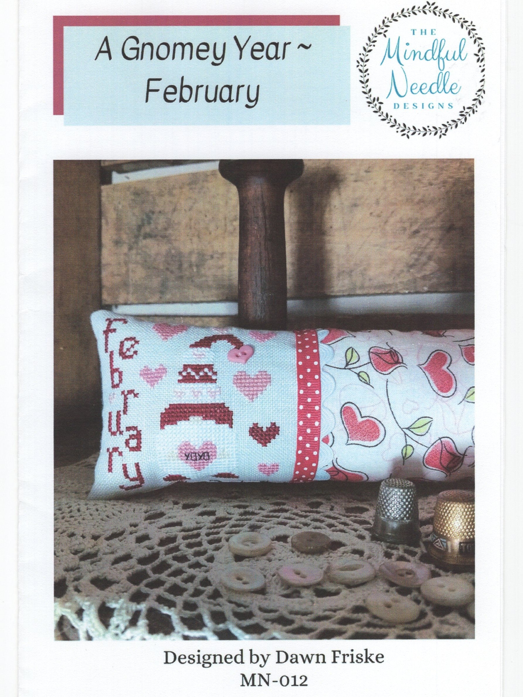 The Mindful Needle Designs' A Gnomey Year - February was designed by Dawn Friske. The model was stitched on 32 count linen (2 strands over 2 threads).