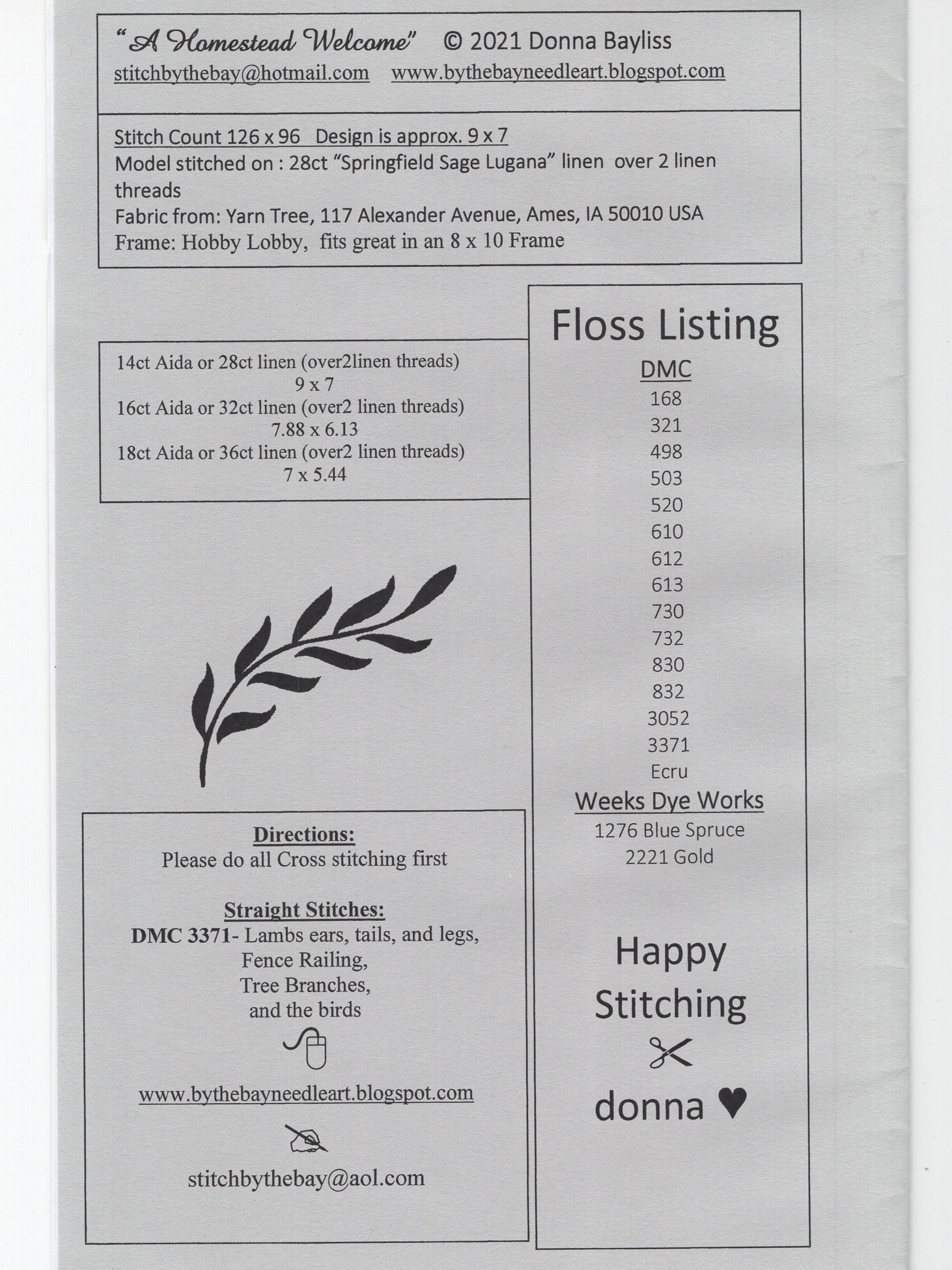 By The Bay Needleart's, A Homestead Welcome was designed by Donna Bayliss.  The model was stitched on 28 count linen (2 strands over 2 threads).