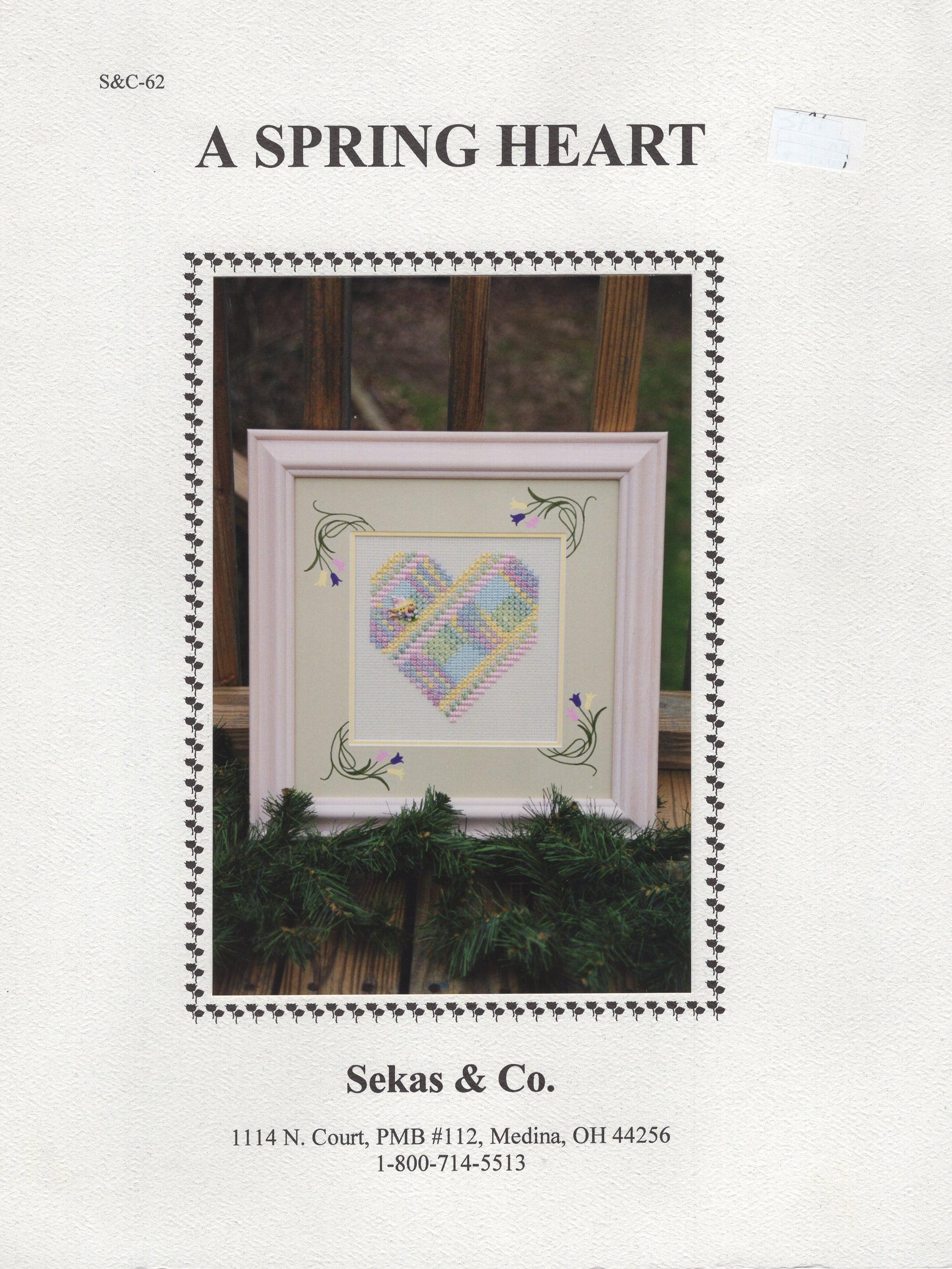 Sekas & Co's, A Spring Heart is a patchwork heart of specialty stitches in beautiful spring colors. The model was stitched on 10 count linen.