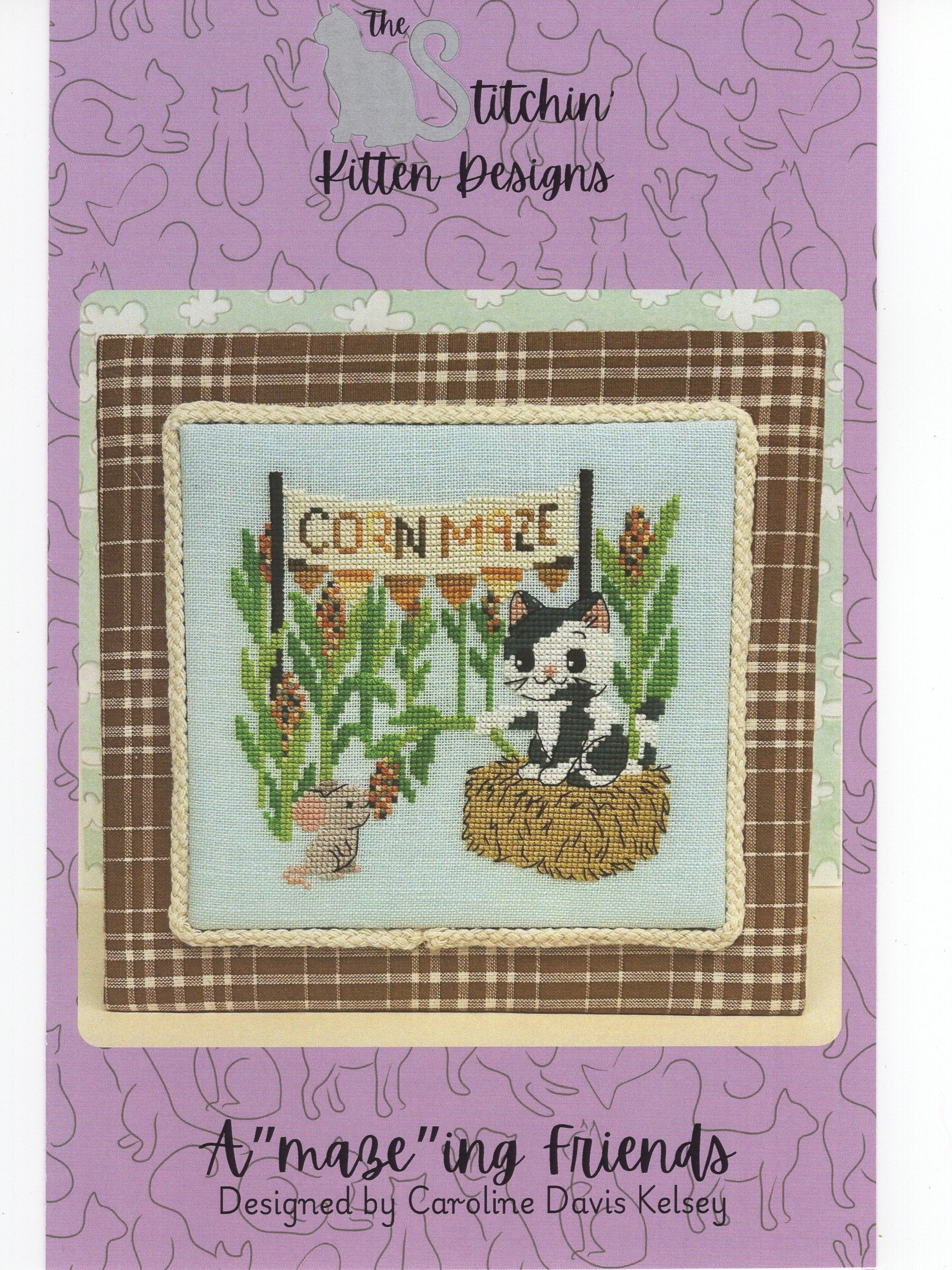 The Stitchin' Kitten Designs' pattern A"maze"ing Friends was designed by Caroline Davis Kelsey. The model was stitched on 32 count linen (2 strands over 2 threads).