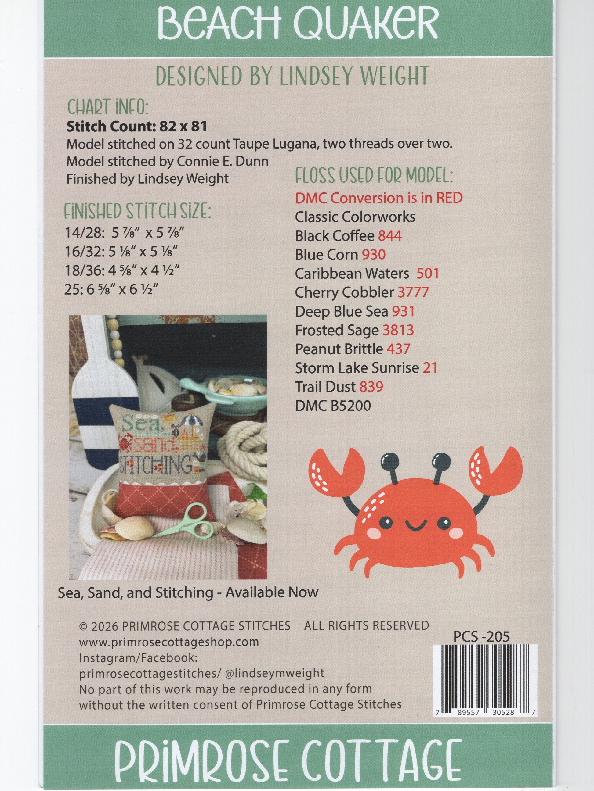 Primrose Cottage's Beach Quaker was designed by Lindsey Weight.  The model was stitched on 32 count linen (2 strands over 2 threads)