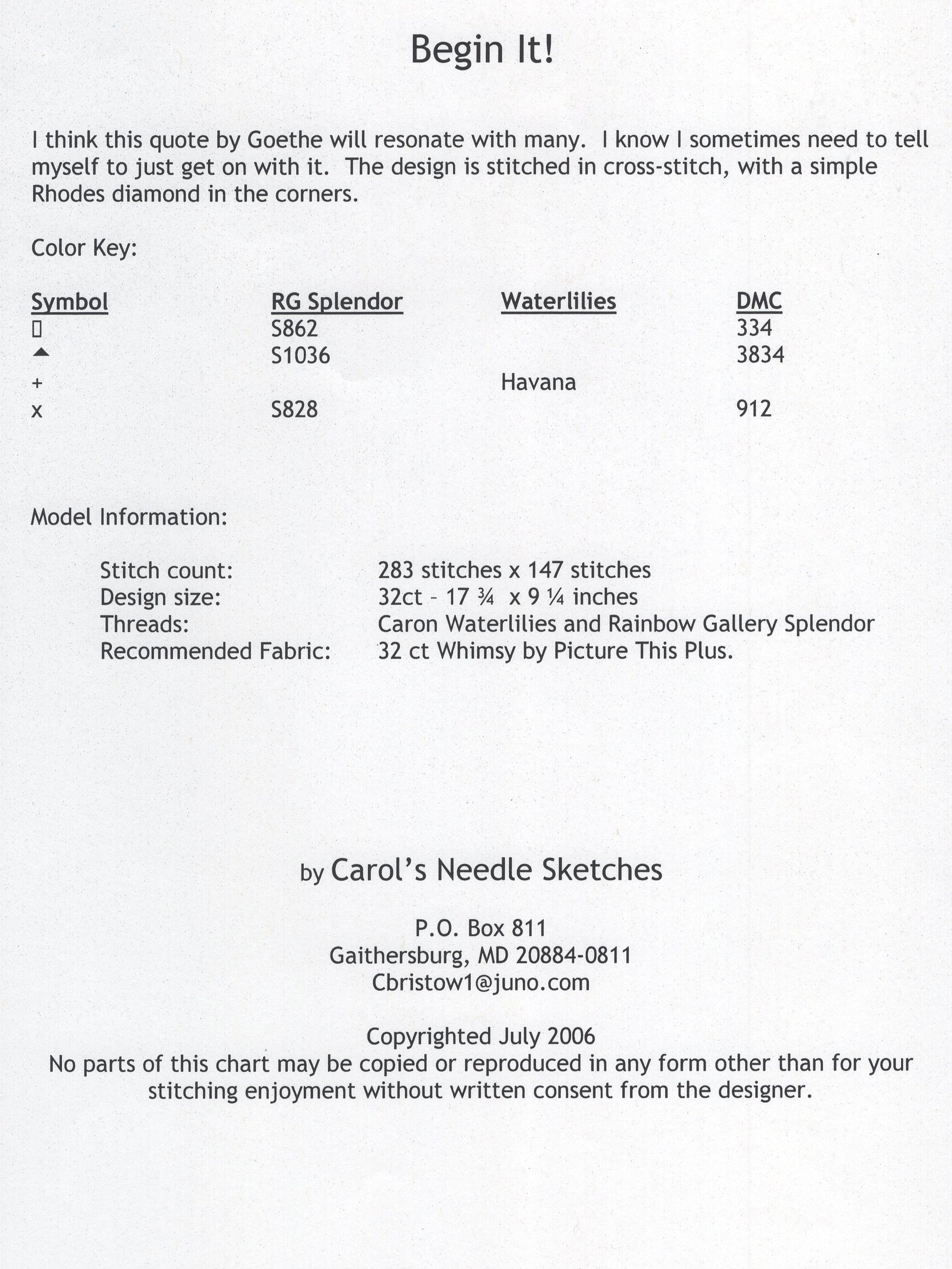 The model for Carol's Needle Sketches' Begin It! was stitched on 32 count linen (2 strands over 2 threads).