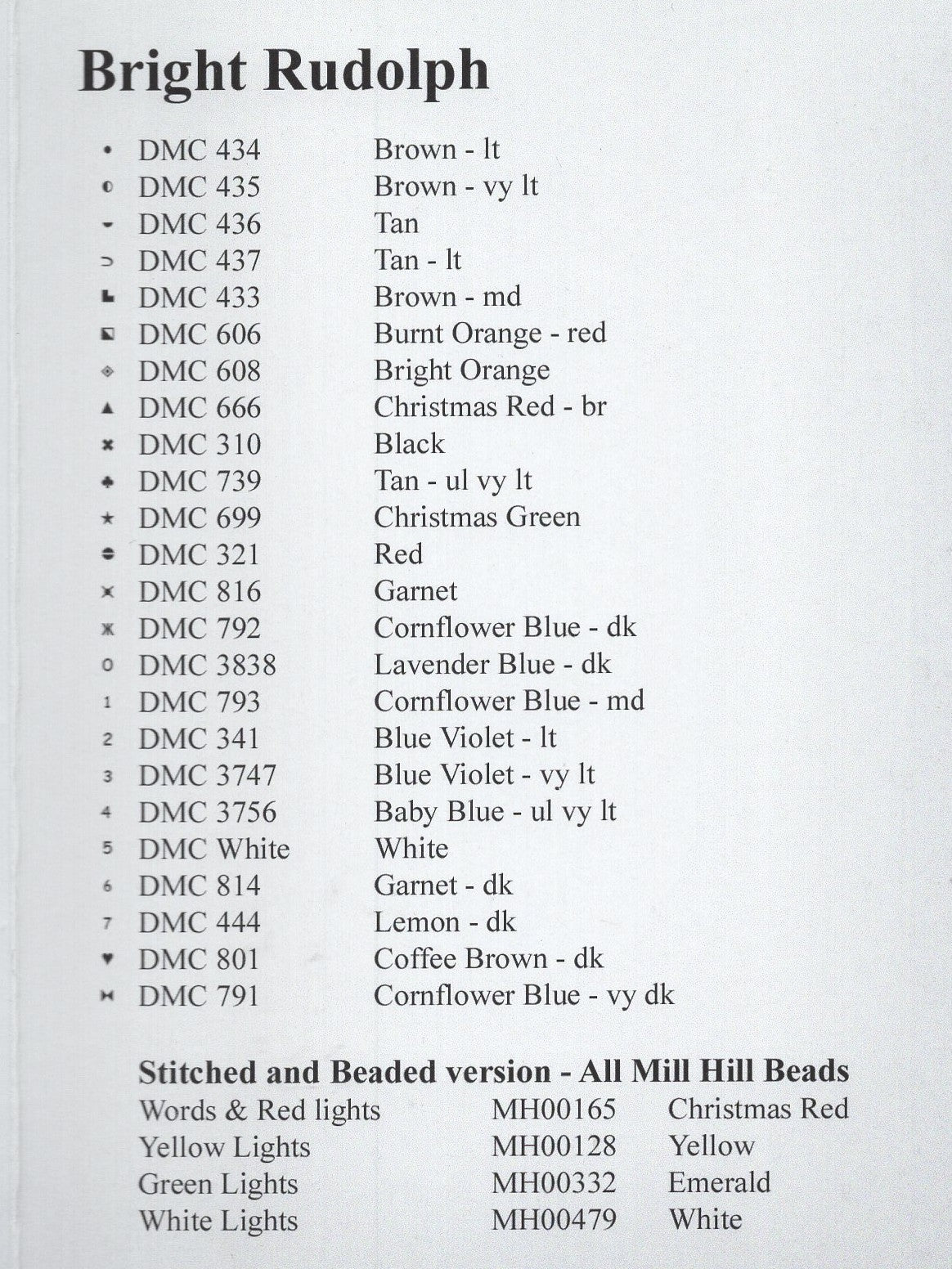The model of Frony Ritter Designs', Bright Rudolph was stitched on 14 count Aida (2 strands over 2 threads).