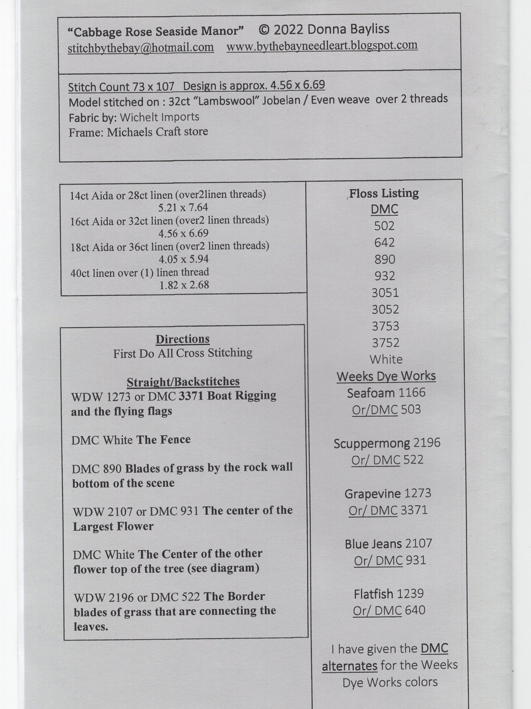 By The Bay Needleart's, Cabbage Rose Seaside Manor was designed by Donna Bayliss.  The model was stitched on 32 count evenweave (2 strands over 2 threads).