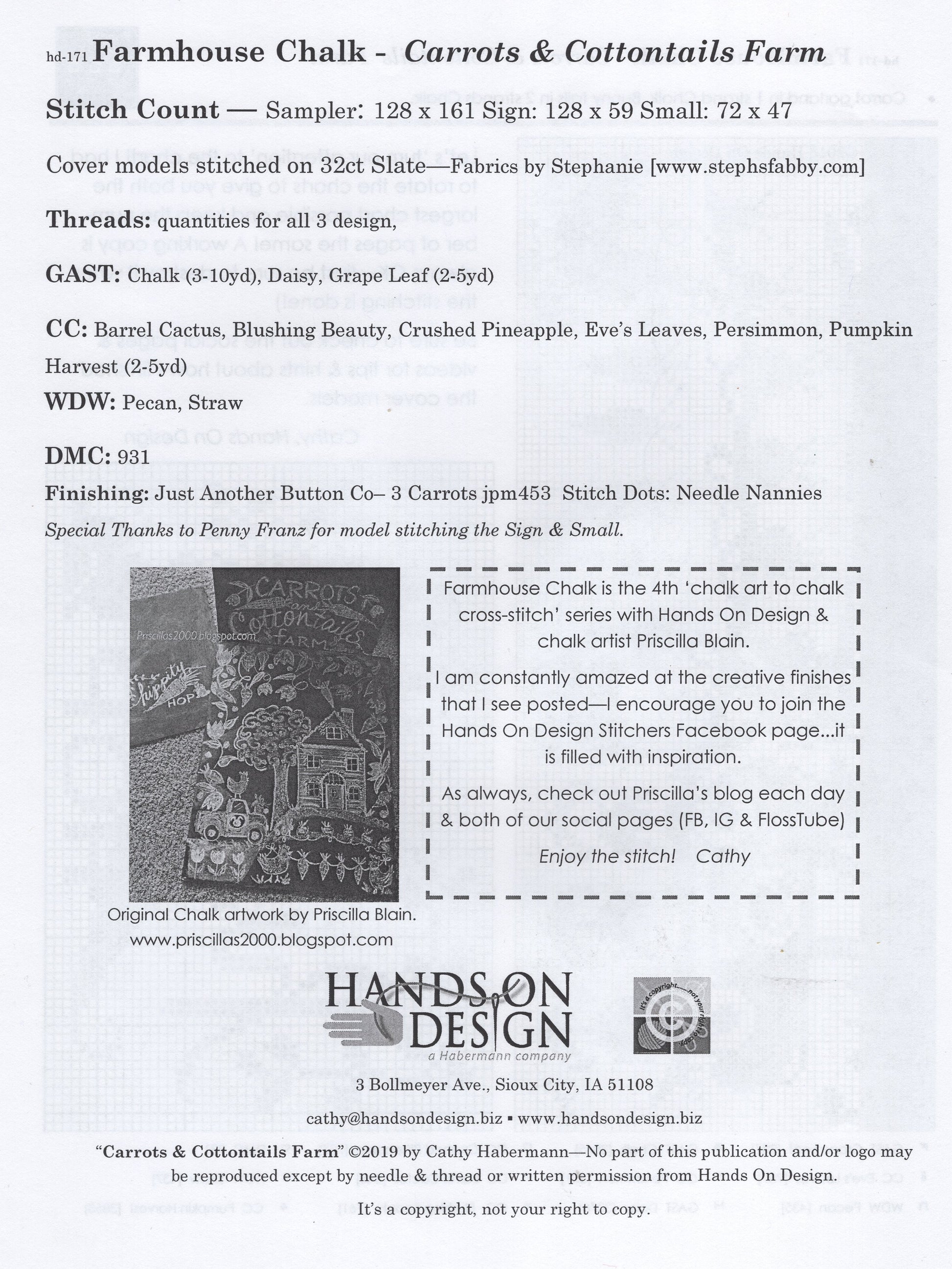Hands On Design's Carrots & Cottontails was designed by Cathy Habermann from chalk art of Priscilla Blain. The model was stitched on 32 count linen