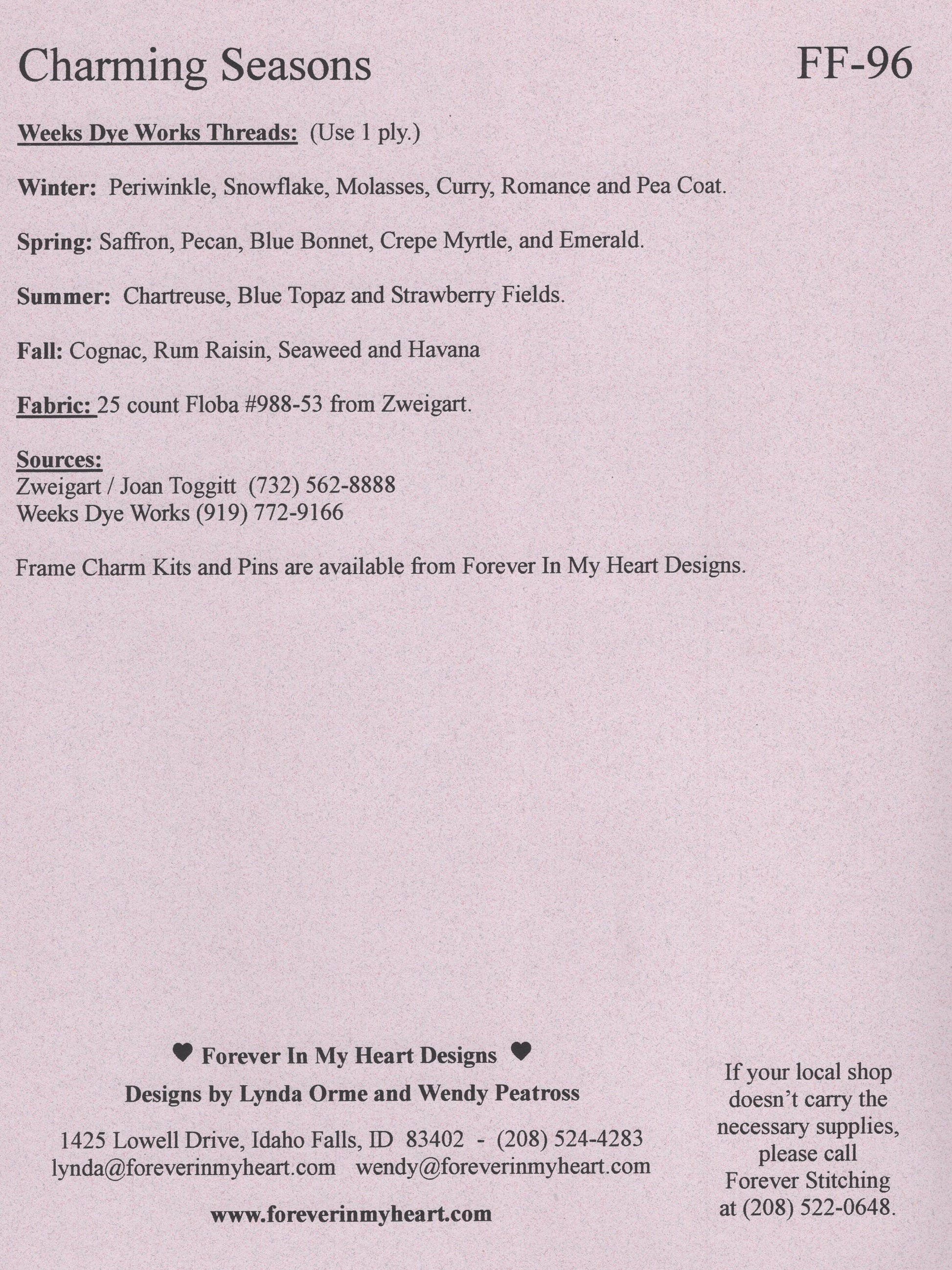 Forever In My Heart's Forever Charming- Charming Seasons was designed by Lynda Orme and Wendy Peatross. The model was stitched on 25 count linen (1 strand over 1 thread). The leaflet contains 4 designs