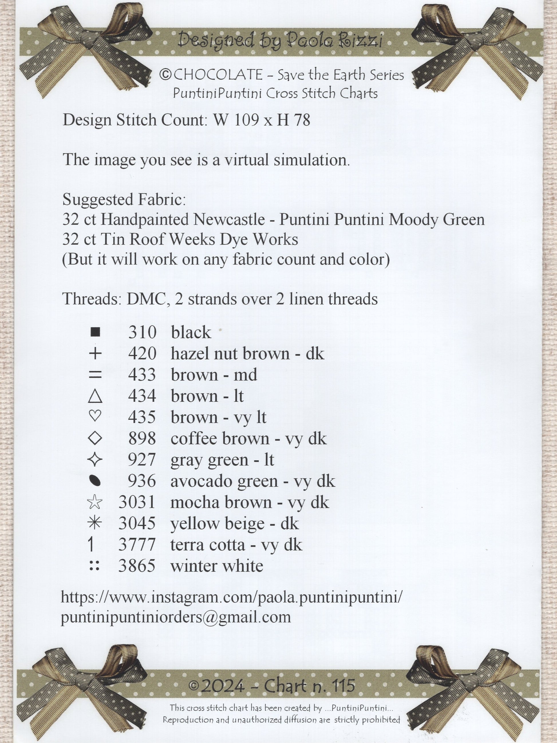 Puntini Puntini's Chocolate pattern from their Save The Earth Series was designed by Paola Rizzi.  The models were stitched on 32 count linen.