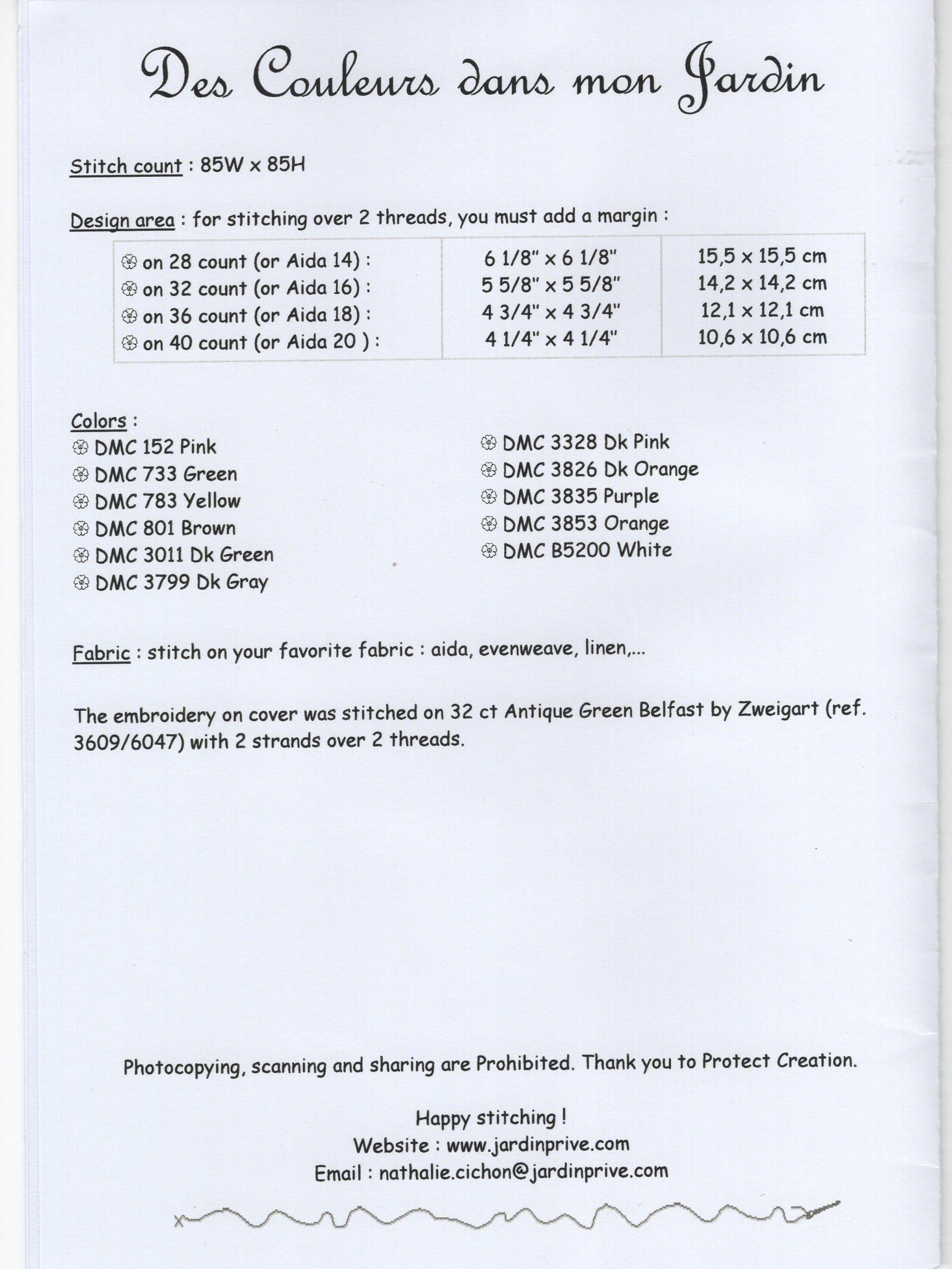 Jardin Prive's Des Couleurs Dans Mon Jardin (Colors in My Garden), FT90-EN - 01 was designed by Nathalie Cichon. The model was stitched on 32 count evenweave (2 strands over 2 threads)