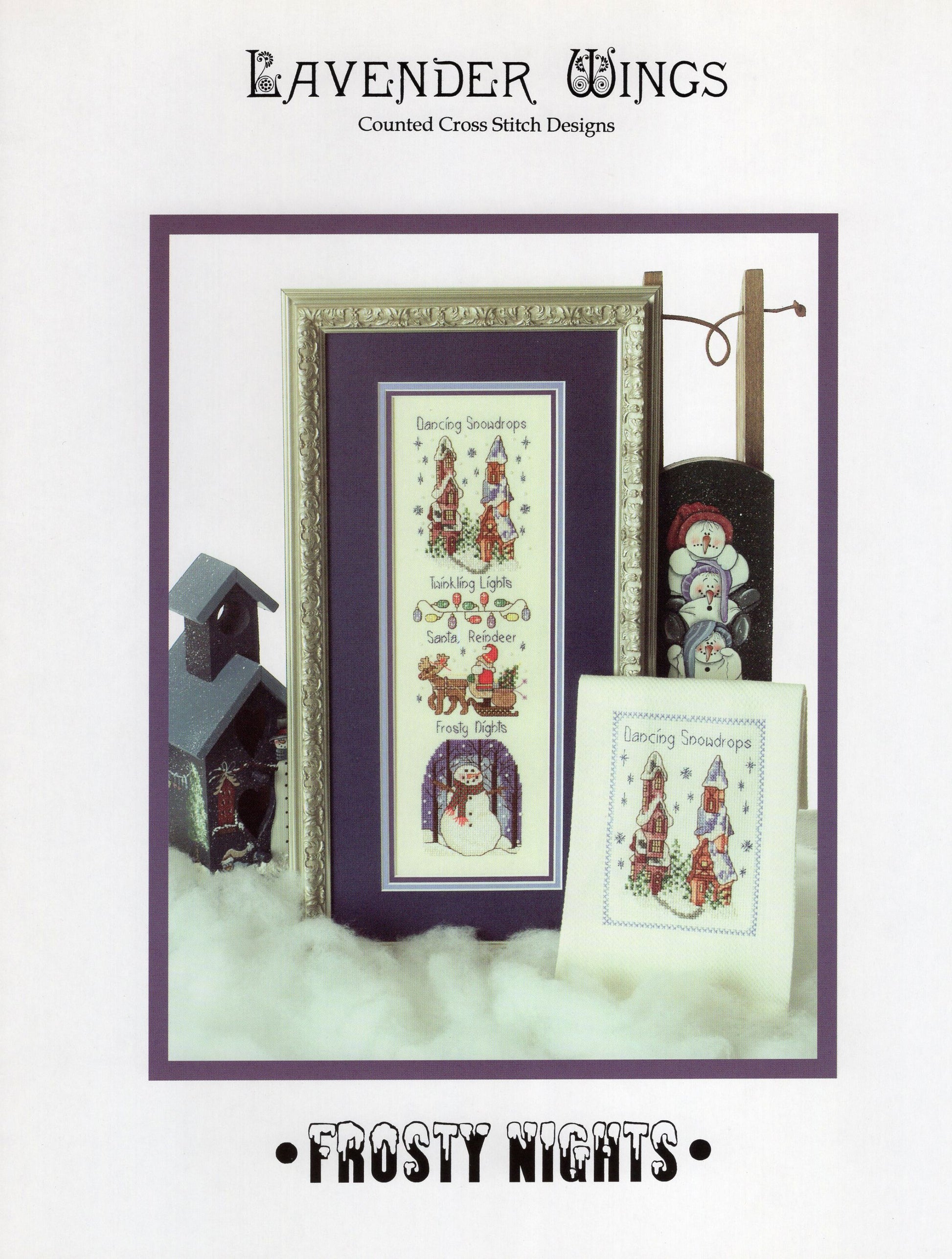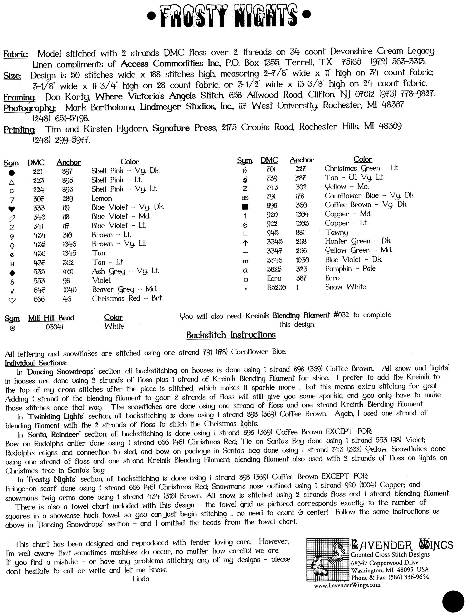 The model for Lavender Wings', Frosty Nights was stitched on 32 count linen (2 threads over 2 strands).