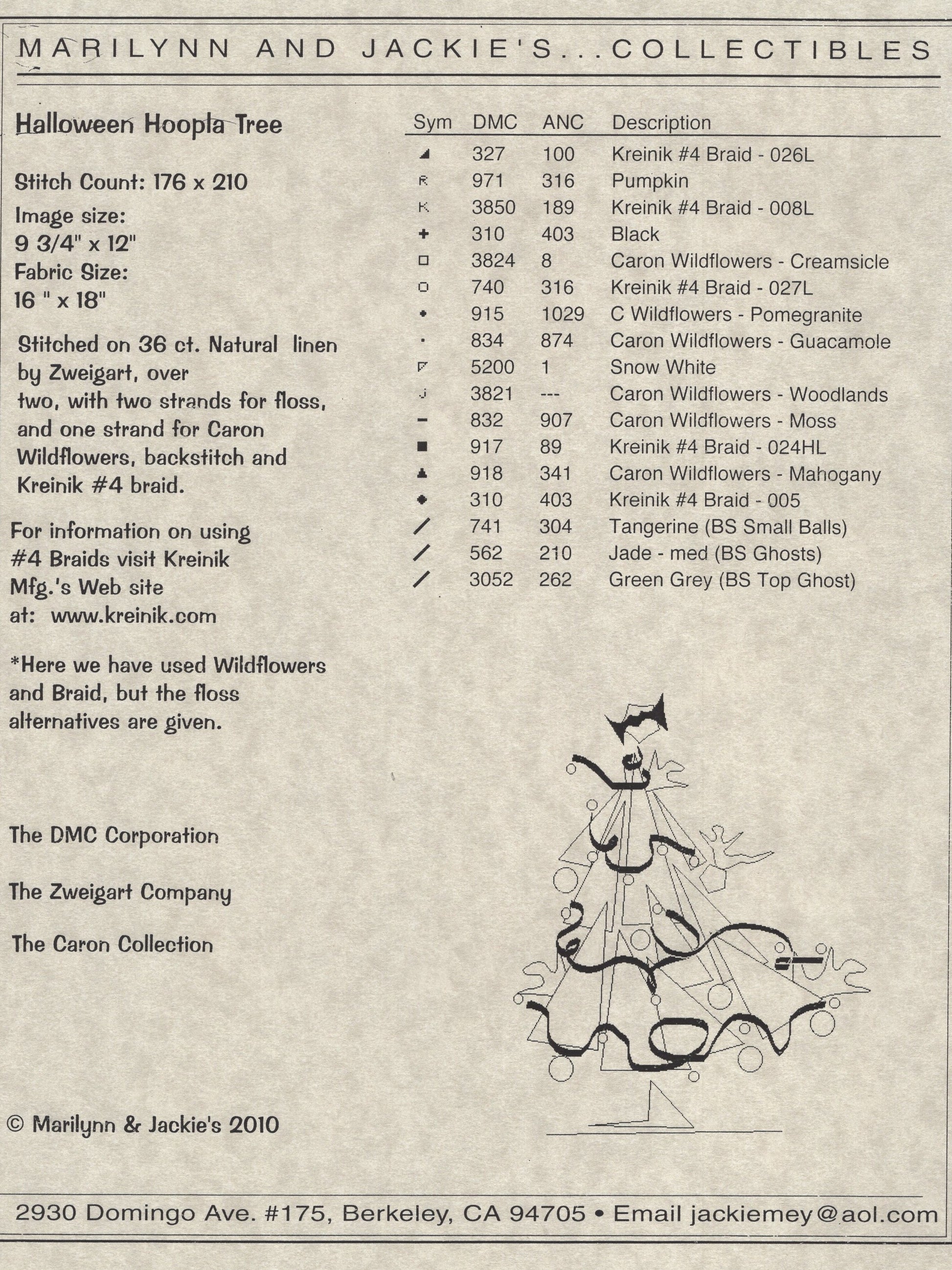 The model for Marilynn & Jackies's Halloween Hoopla Tree was stitched on 36 count linen (2 strands over 2 threads).