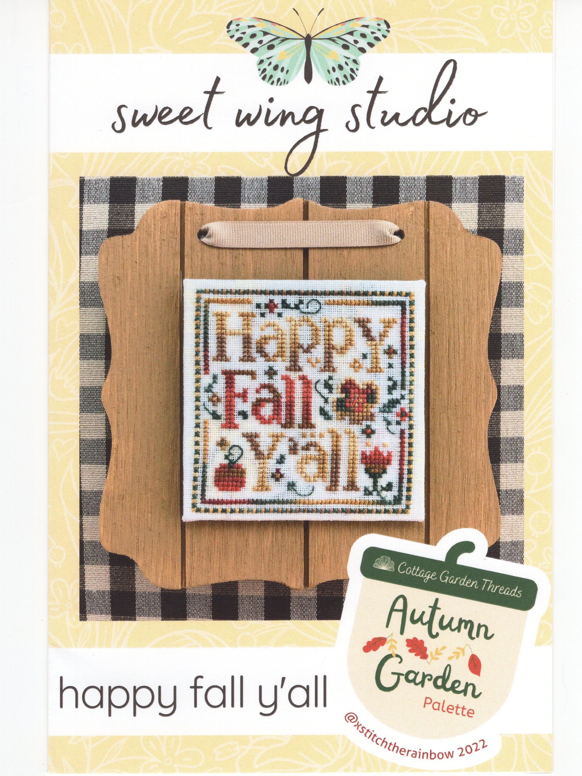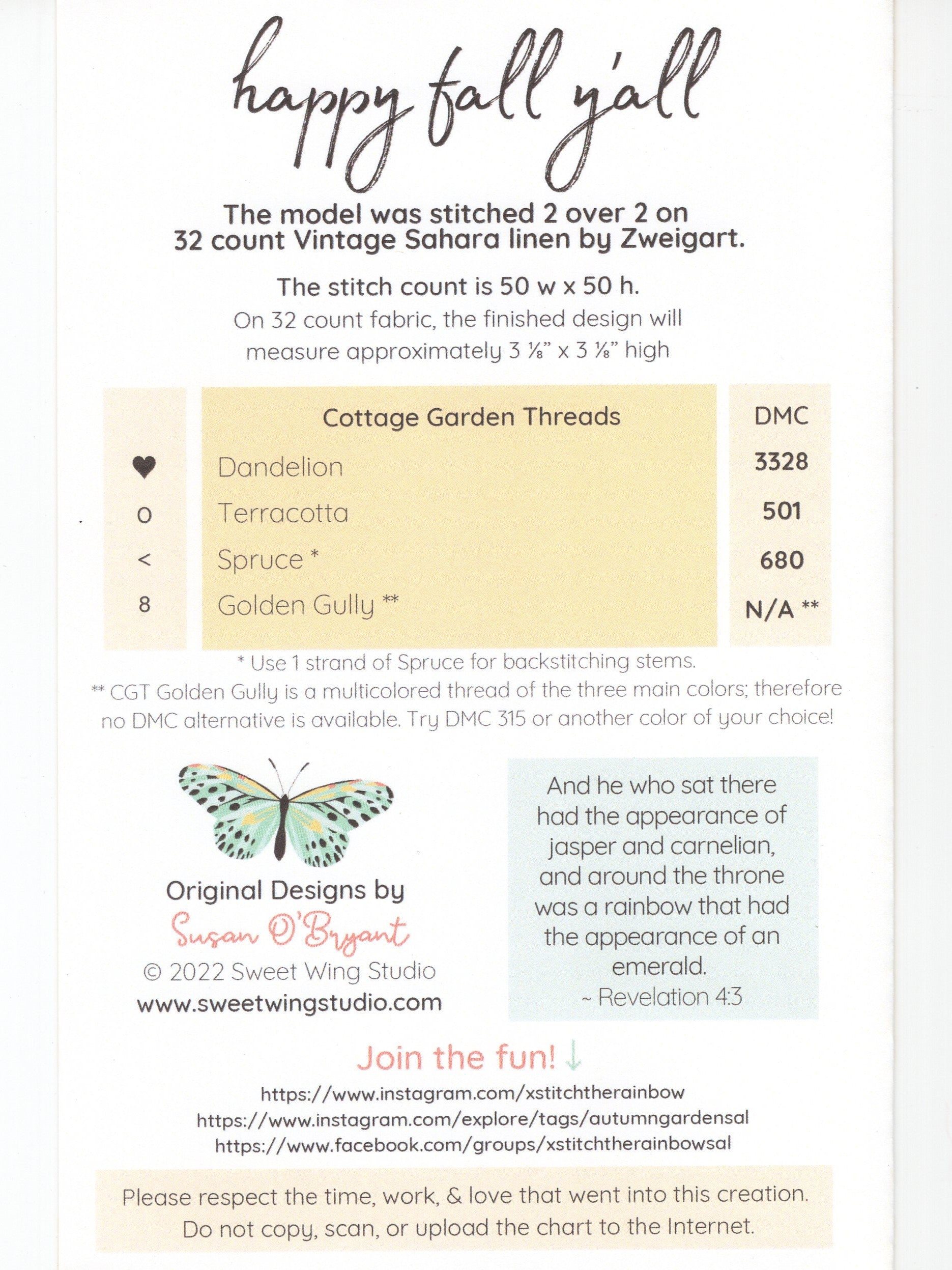 Sweet Wing Studio's Happy Fall Y'all was designed by Susan O'Bryant.  The model was stitched on 32 count linen (2 strands over 2 threads)