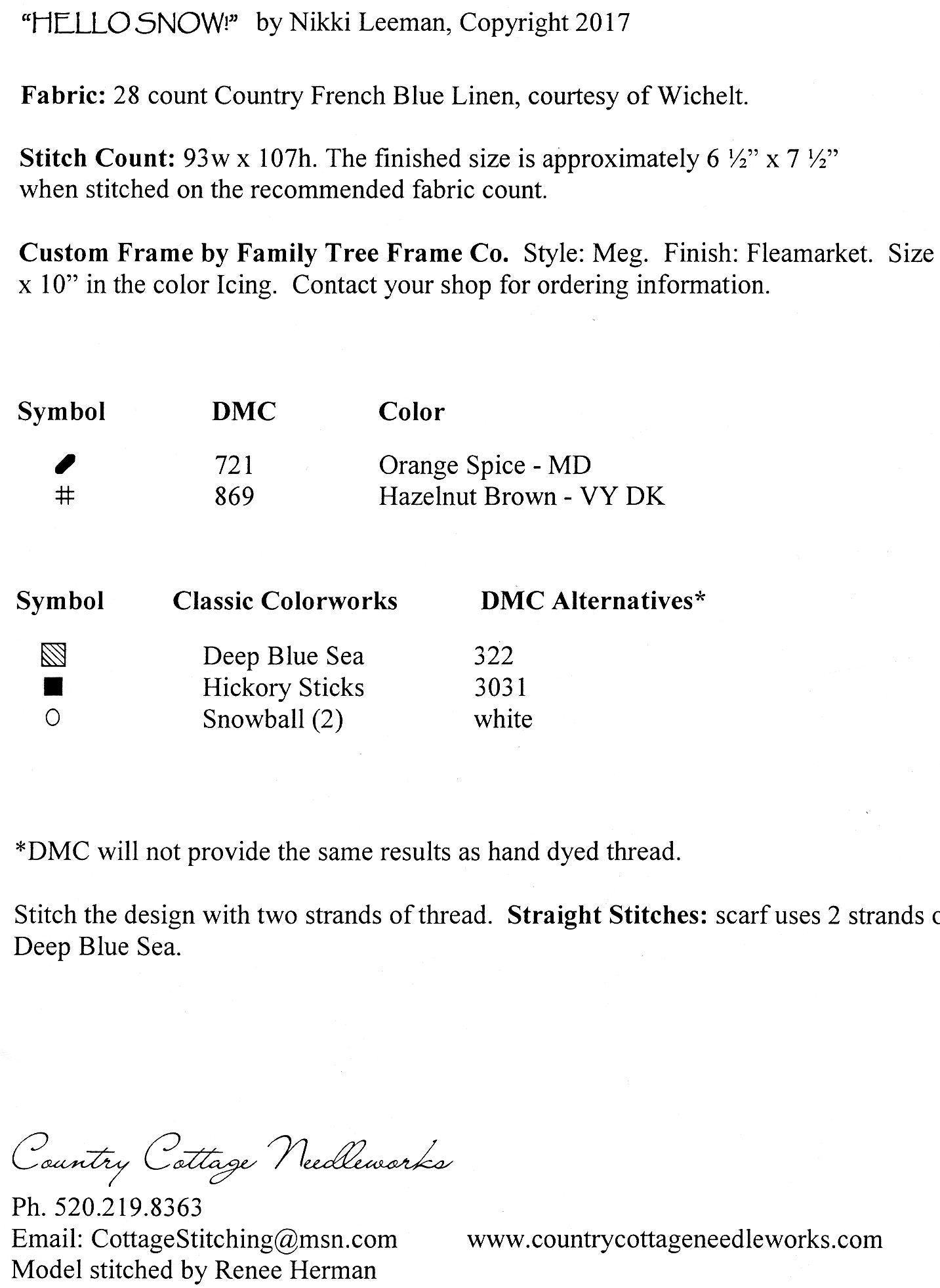 The model for Country Cottage Needleworks', Hello Snow was stitched on 28 count linen (2 threads over 2 strands).
