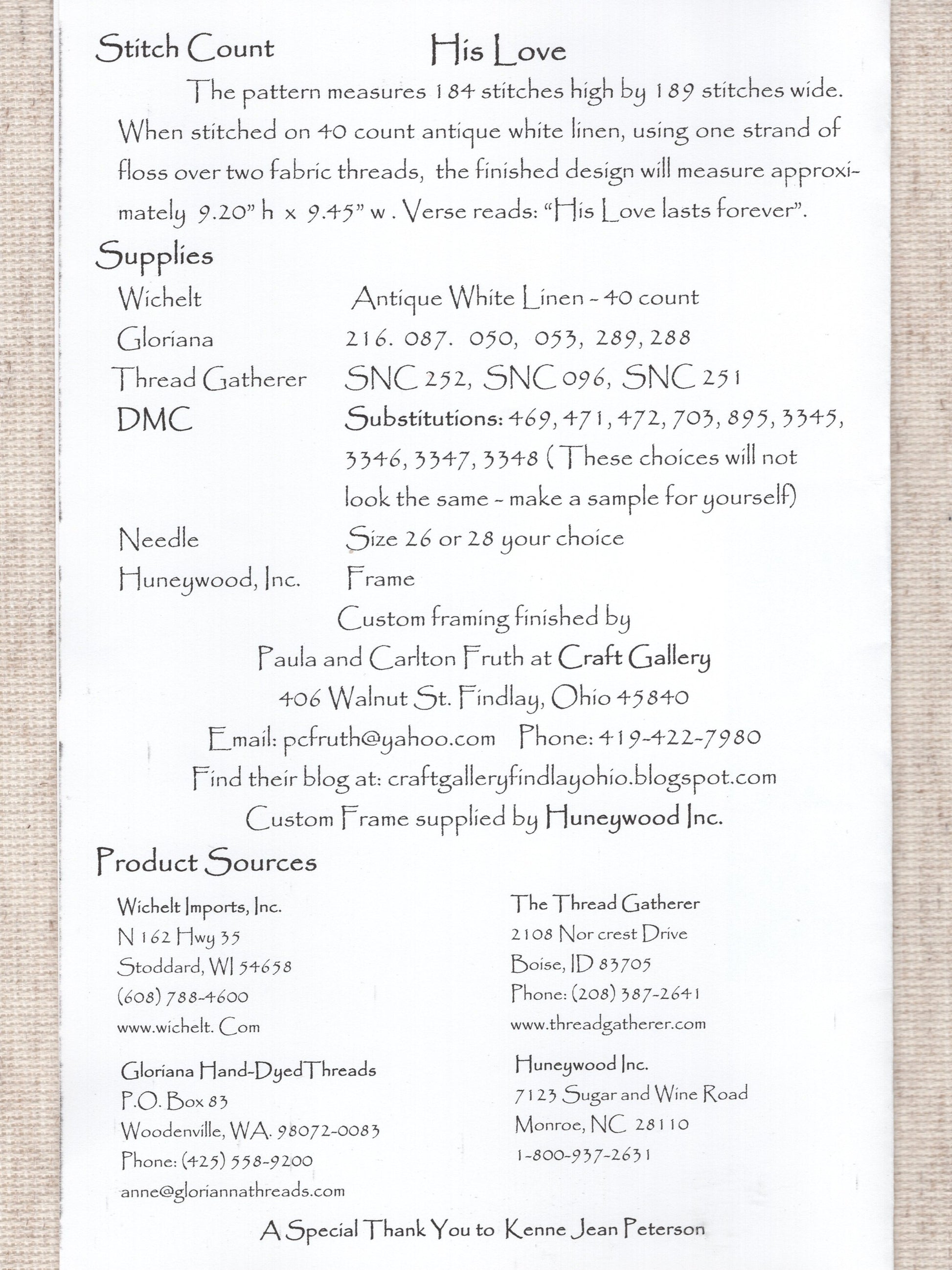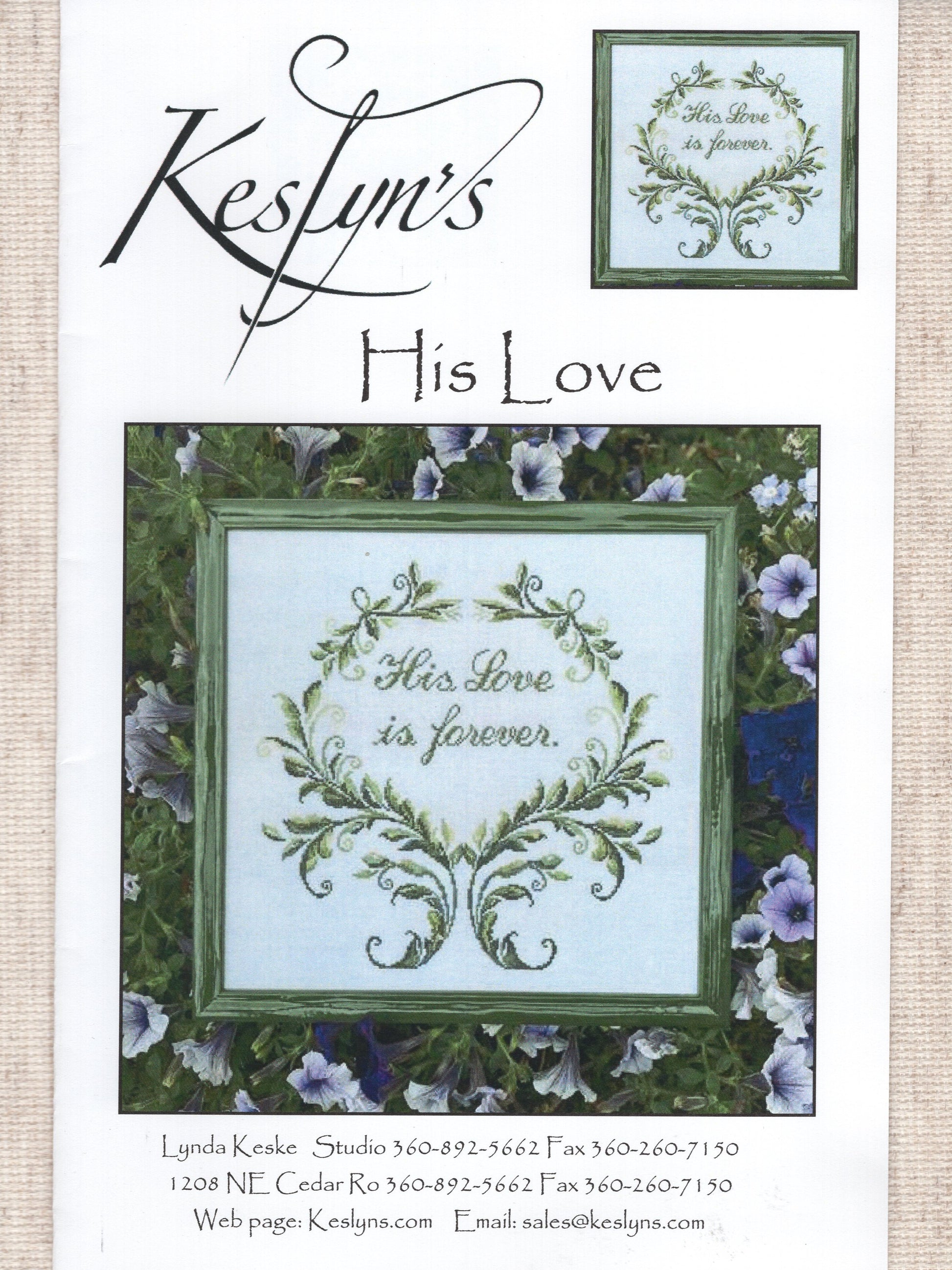 Keslyn's His Love pattern was designed by Lynda Keske.  The model was stitched on 40 count linen (1 thread over 2 strands).