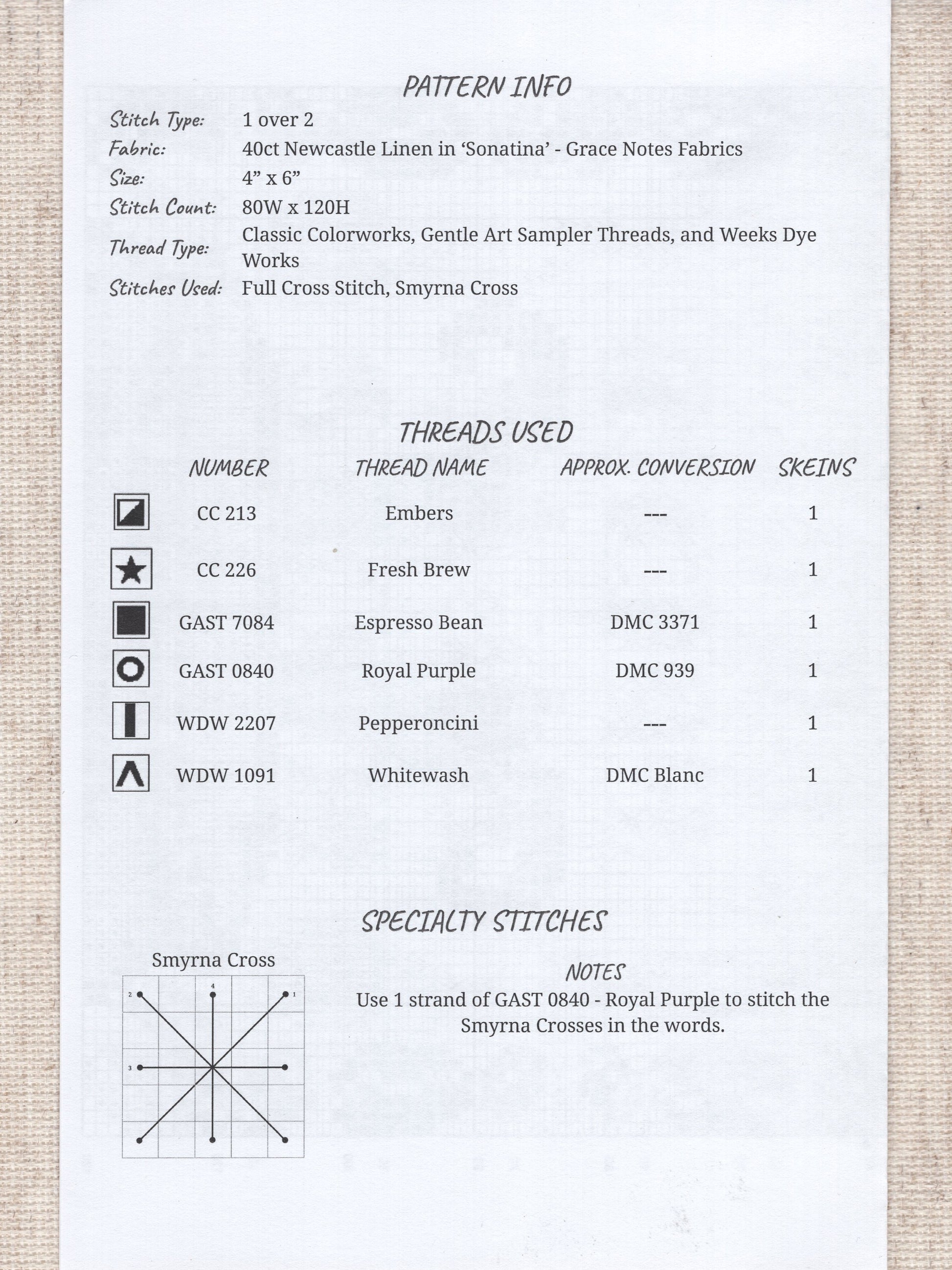 This pattern does not have any fractional stitches or backstitching but does have a few Smyrna Crosses.