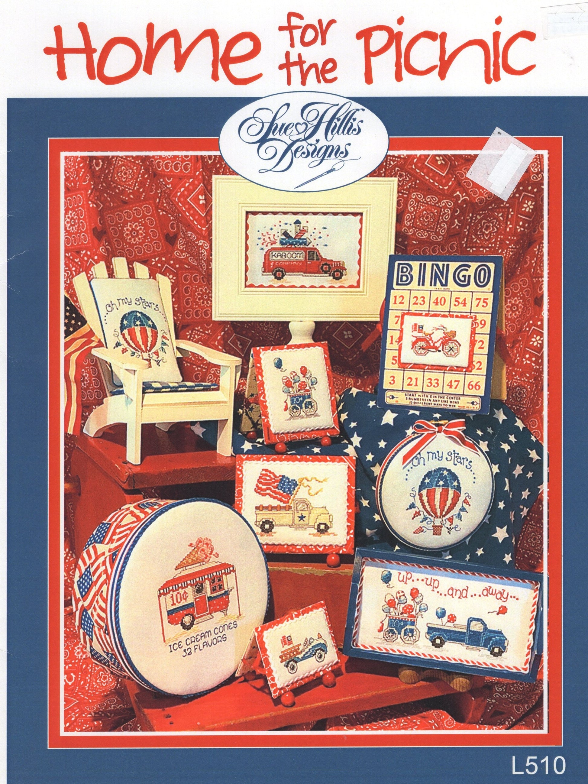The Sue Hillis Designs' Home for the Picnic leaflet contains 8 patterns