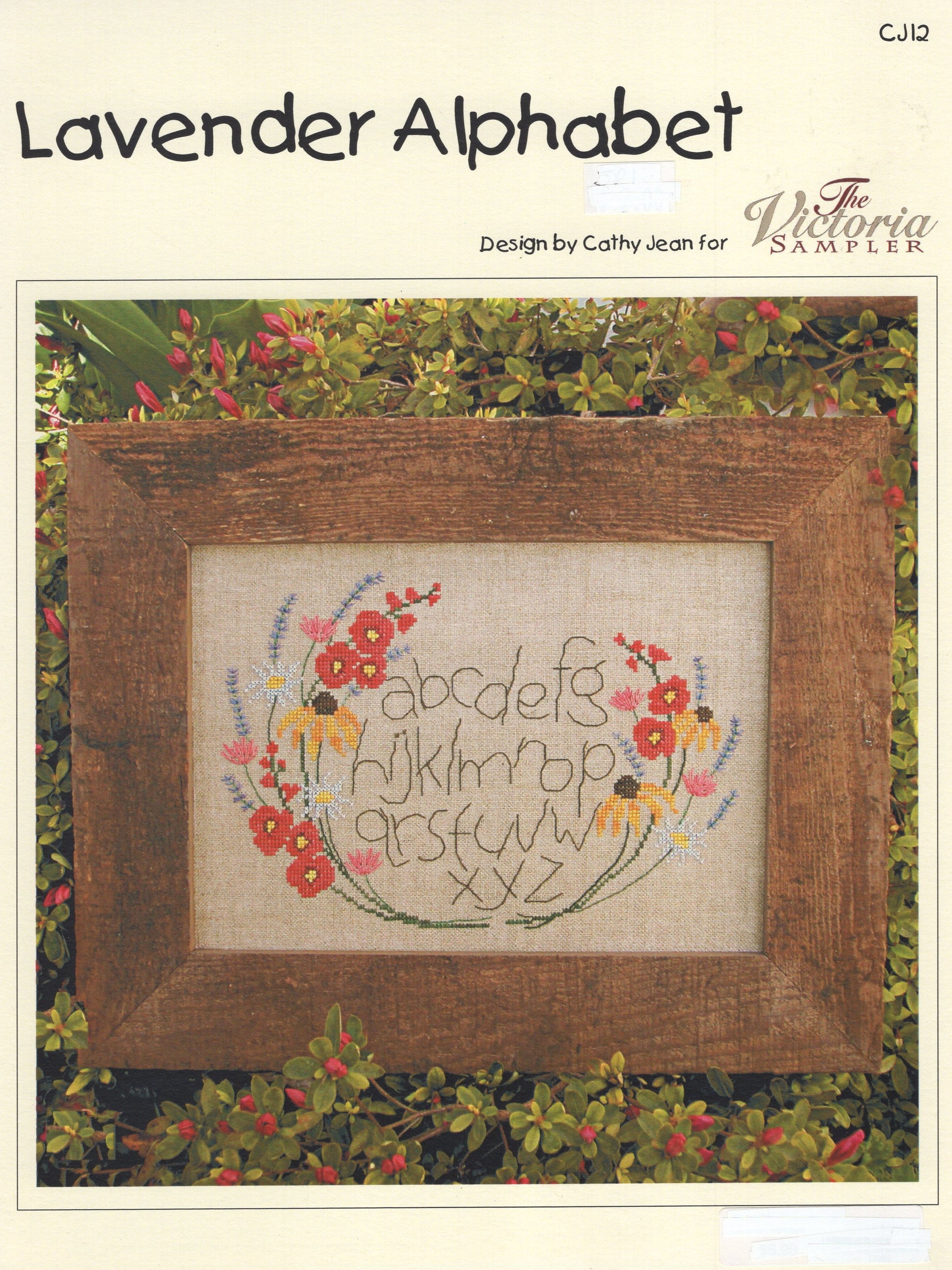 The Victoria Sampler's Lavender Alphabet was designed by Thea Dueck.  The model was stitched on 25 count linen (2 strands over 2 threads).