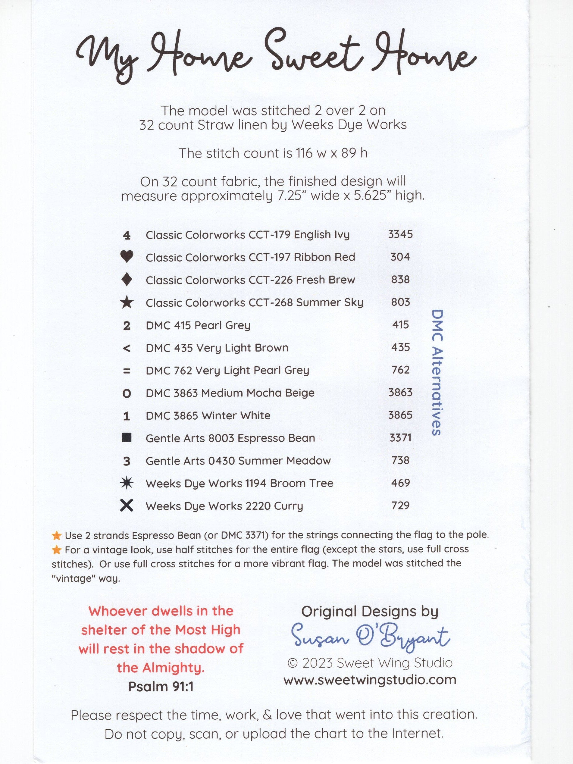 Sweet Wing Studio's My Home Sweet Home was designed by Susan O'Bryant.  The model was stitched on 32 count linen (2 strands over 2 threads)