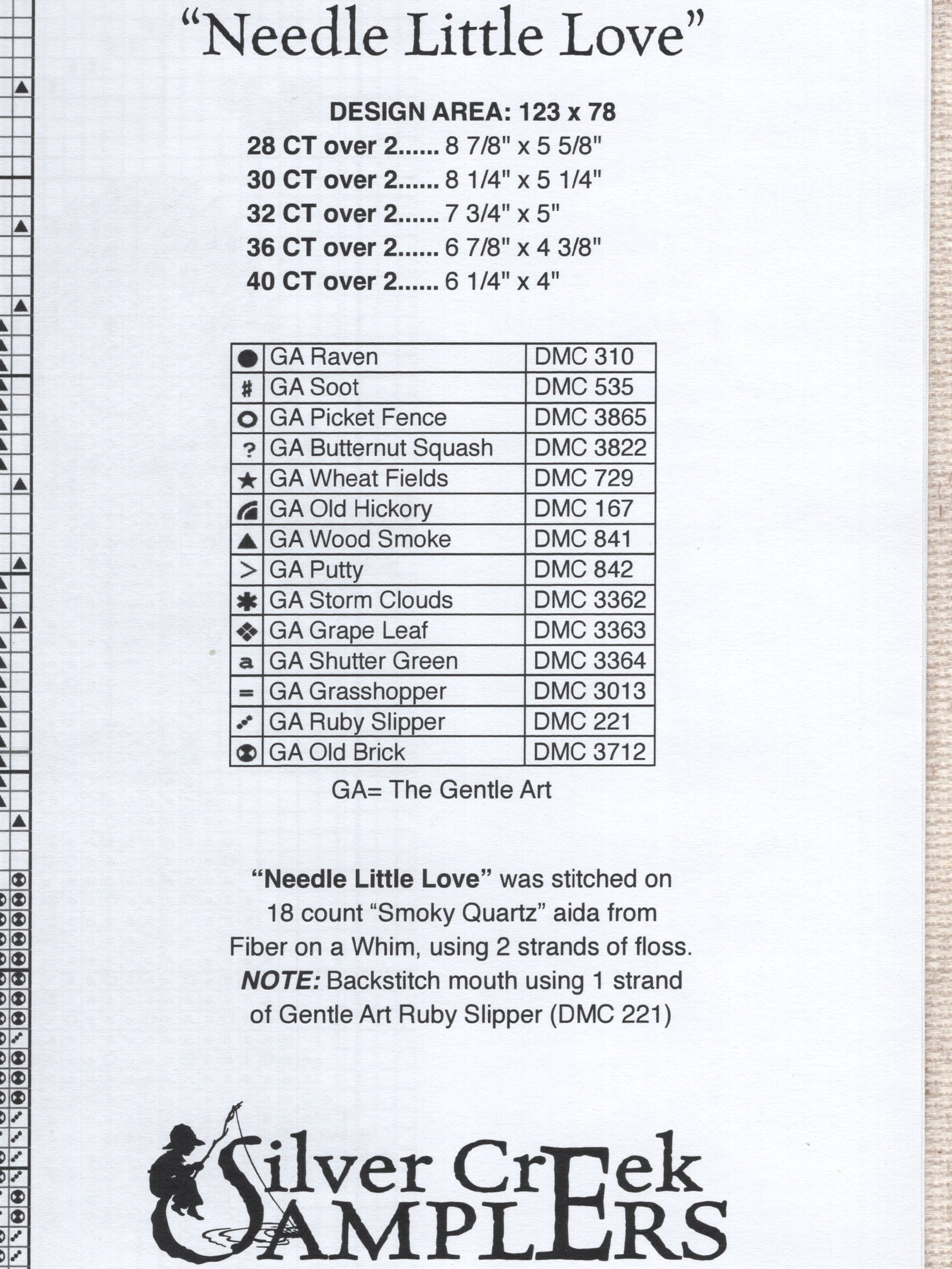 Silver Creek Samplers' Needle Little Love pattern was designed by Diane Randall. The model was stitched on 18 count Aida.