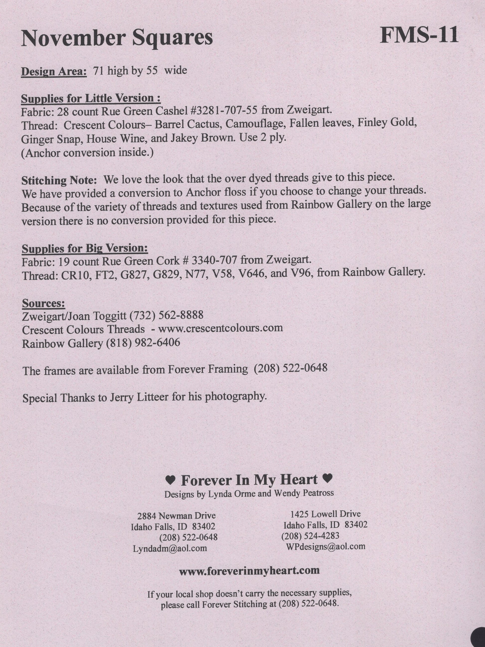 Forever In My Heart's November Squares was designed by Lynda Orme and Wendy Peatross. The model was stitched on 28 count evenweave (2 strands over 2 threads).