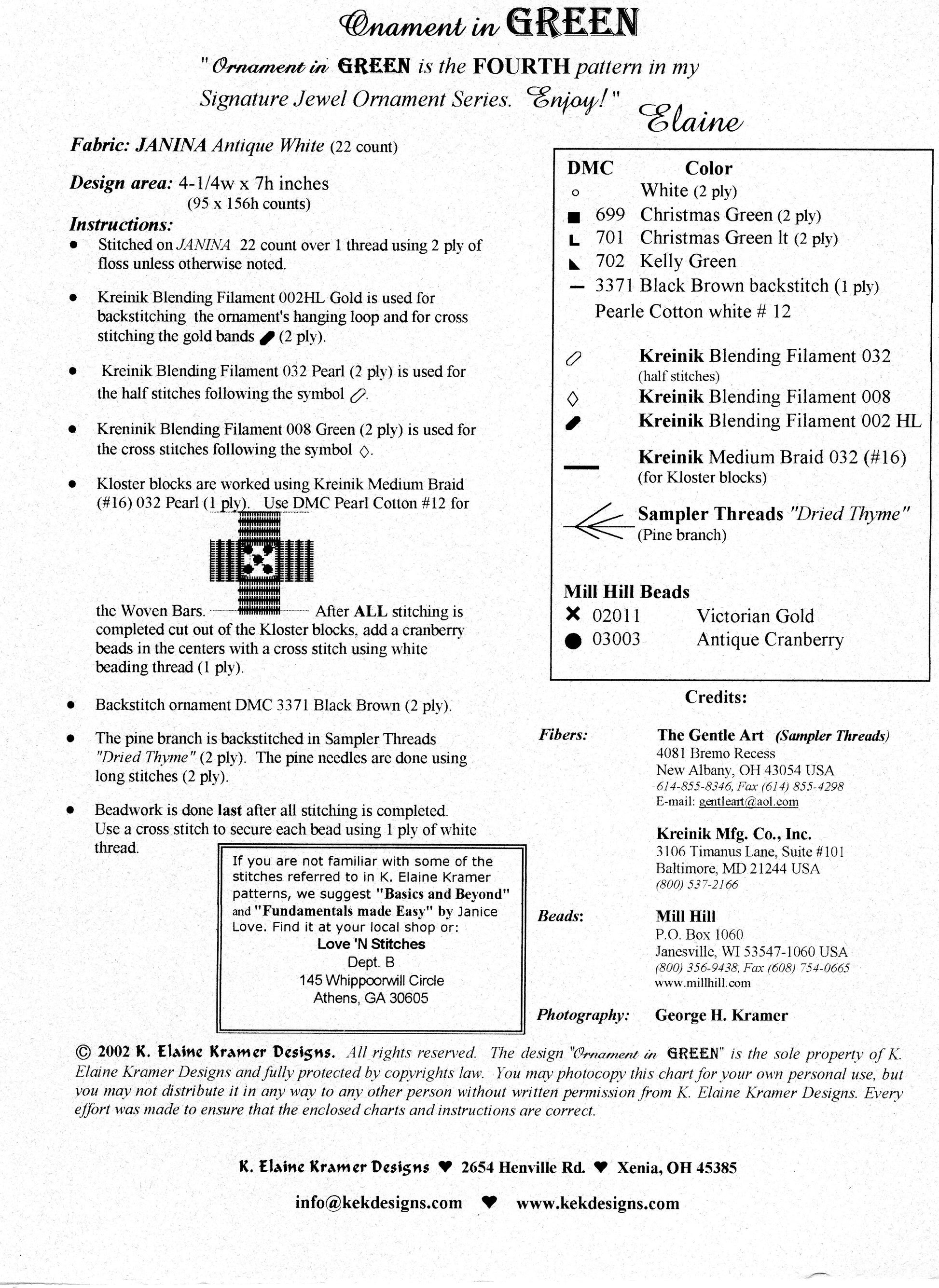 Designs by Elaine used 's 22 count evenweave (2 threads over 2 strands) on the Ornament in Green pattern.  This was the forth of the Jewel Ornament Series.