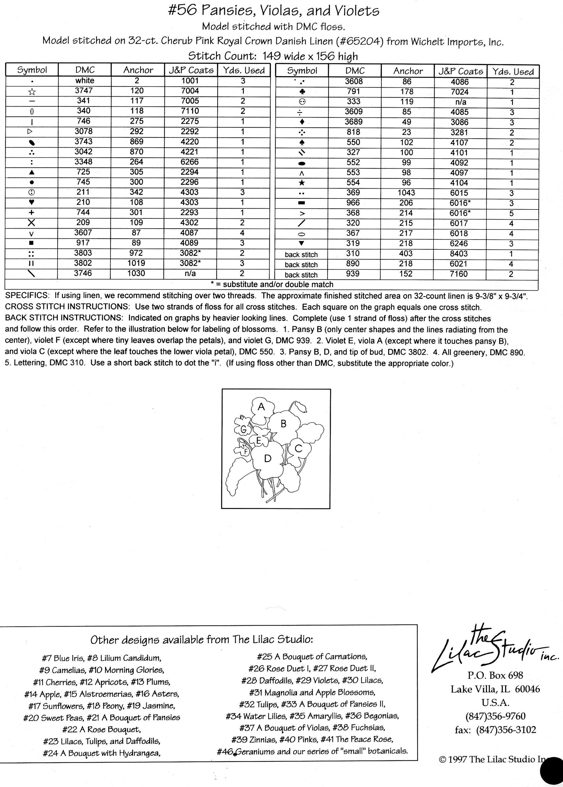 The Lilac Studio's, Pansies, Violas, and Violets was designed by Cindy Rice. The model was stitched on 32 count linen (2 strands over 2 threads).