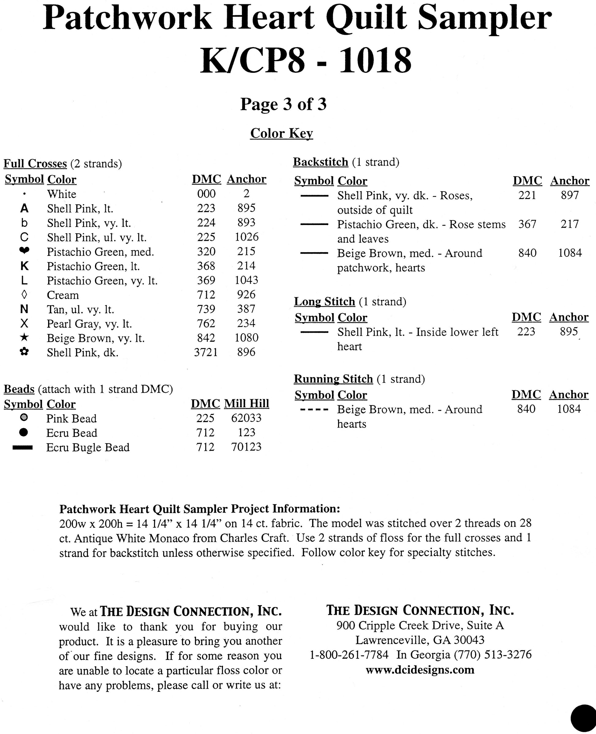 The Design Connection's, Patchwork Heart Quilt Sampler was designed by Linda Bird.  The model was stitched on 28 count Aida (2 strands over 2 threads).  This pattern does include the embellishment pack.