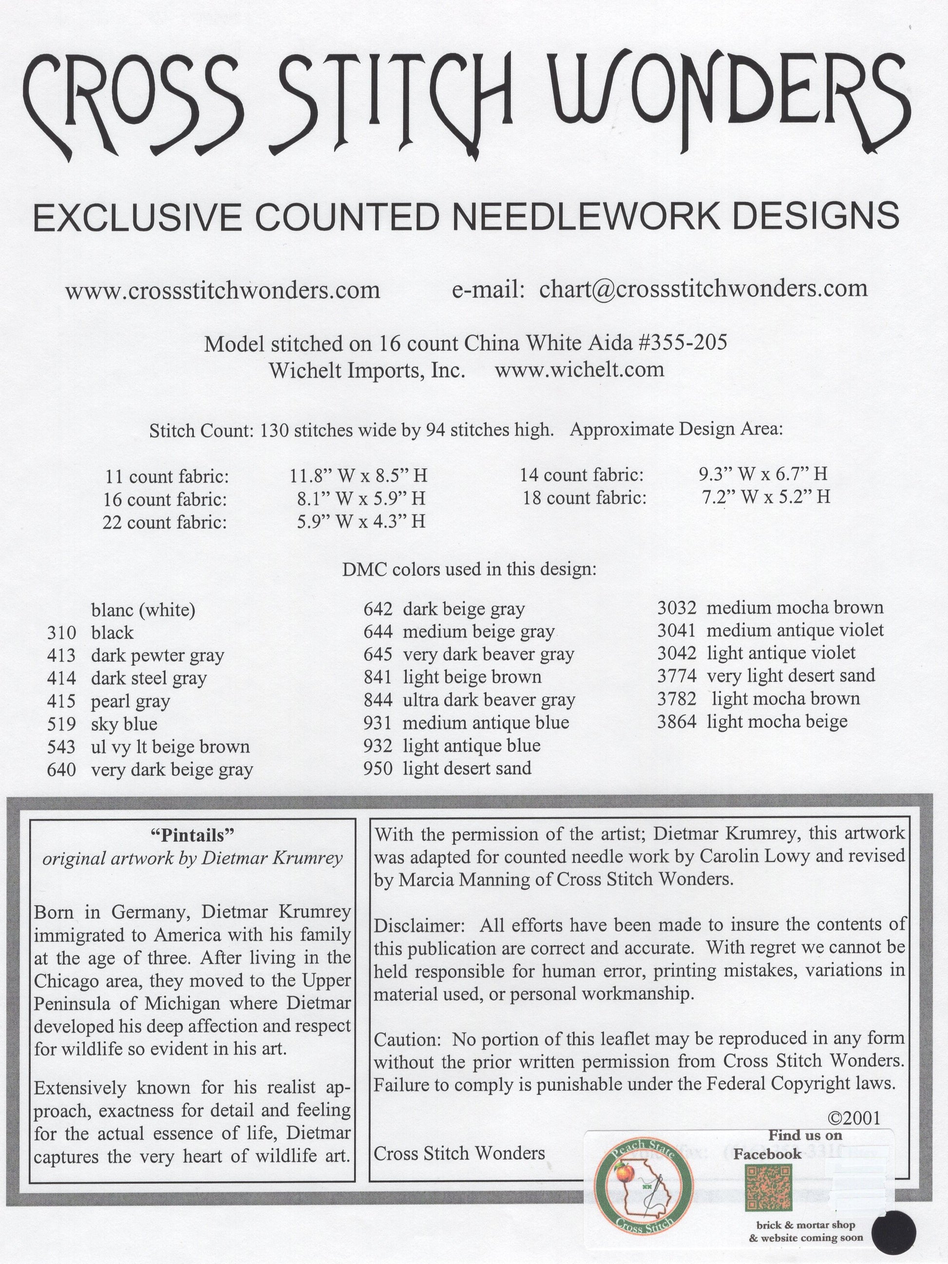 Cross Stitch Wonders' Pintail Landing was adapted to cross stitch by Carolin Lowy and Marcia Manning.  It's based on original artwork by Joann George.  The model was stitched on 16 count Aida.