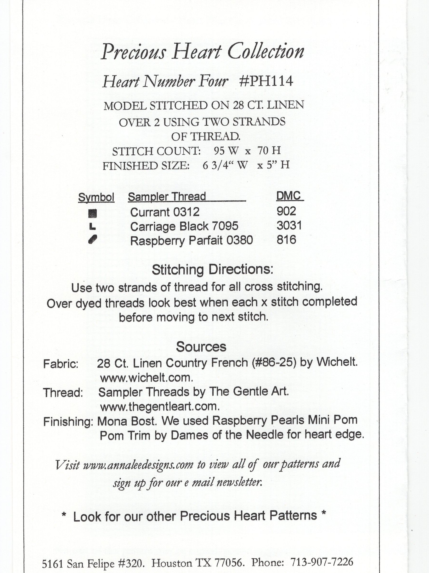 The model of AnnaLee Waite Designs' Precious Heart Collection, Heart 4 was stitched on 28 count evenweave (2 strands over 2 threads).