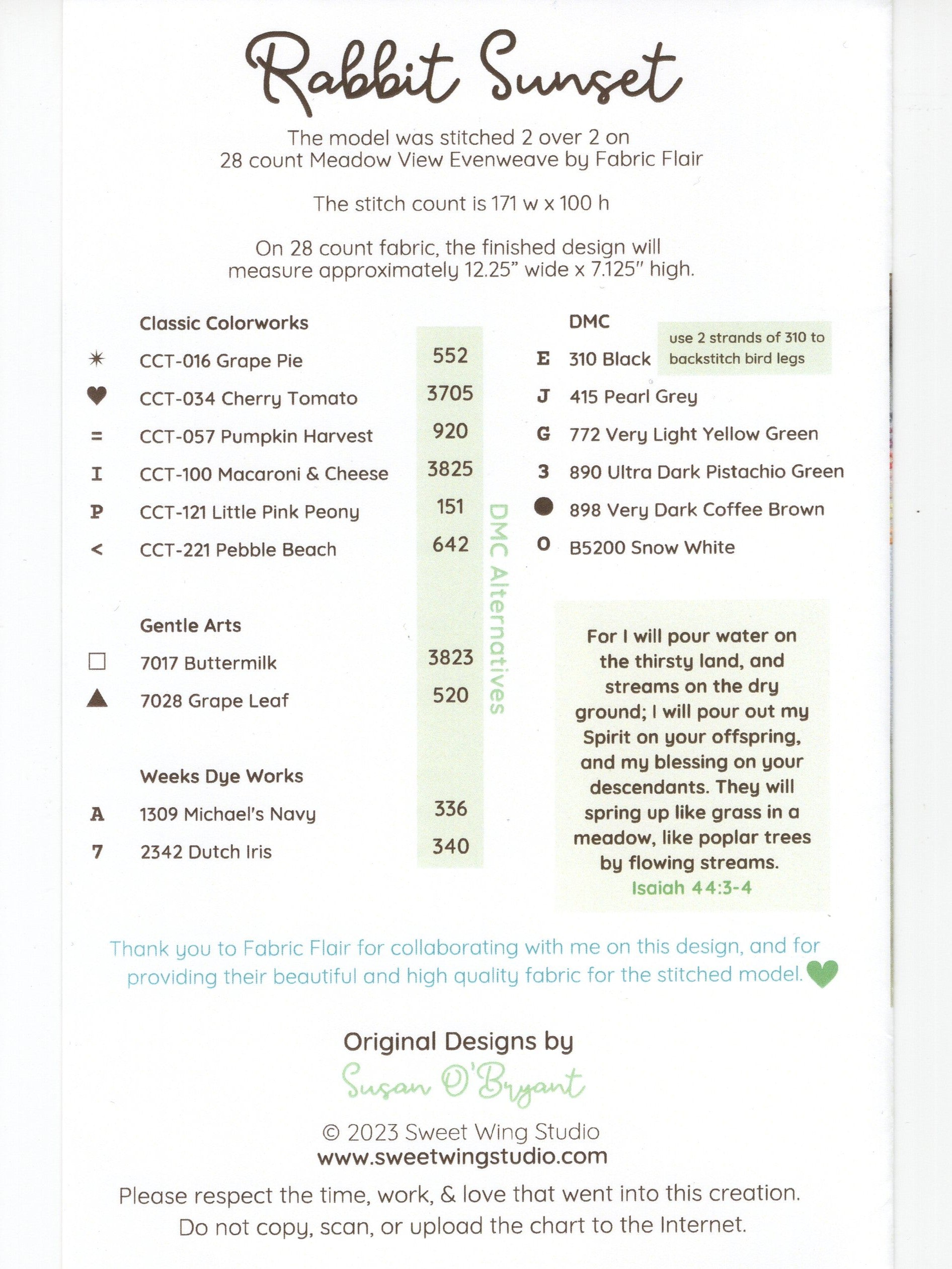 Sweet Wing Studio's Rabbit Sunset was designed by Susan O'Bryant.  The model was stitched on 32 count evenweave (2 strands over 2 threads)