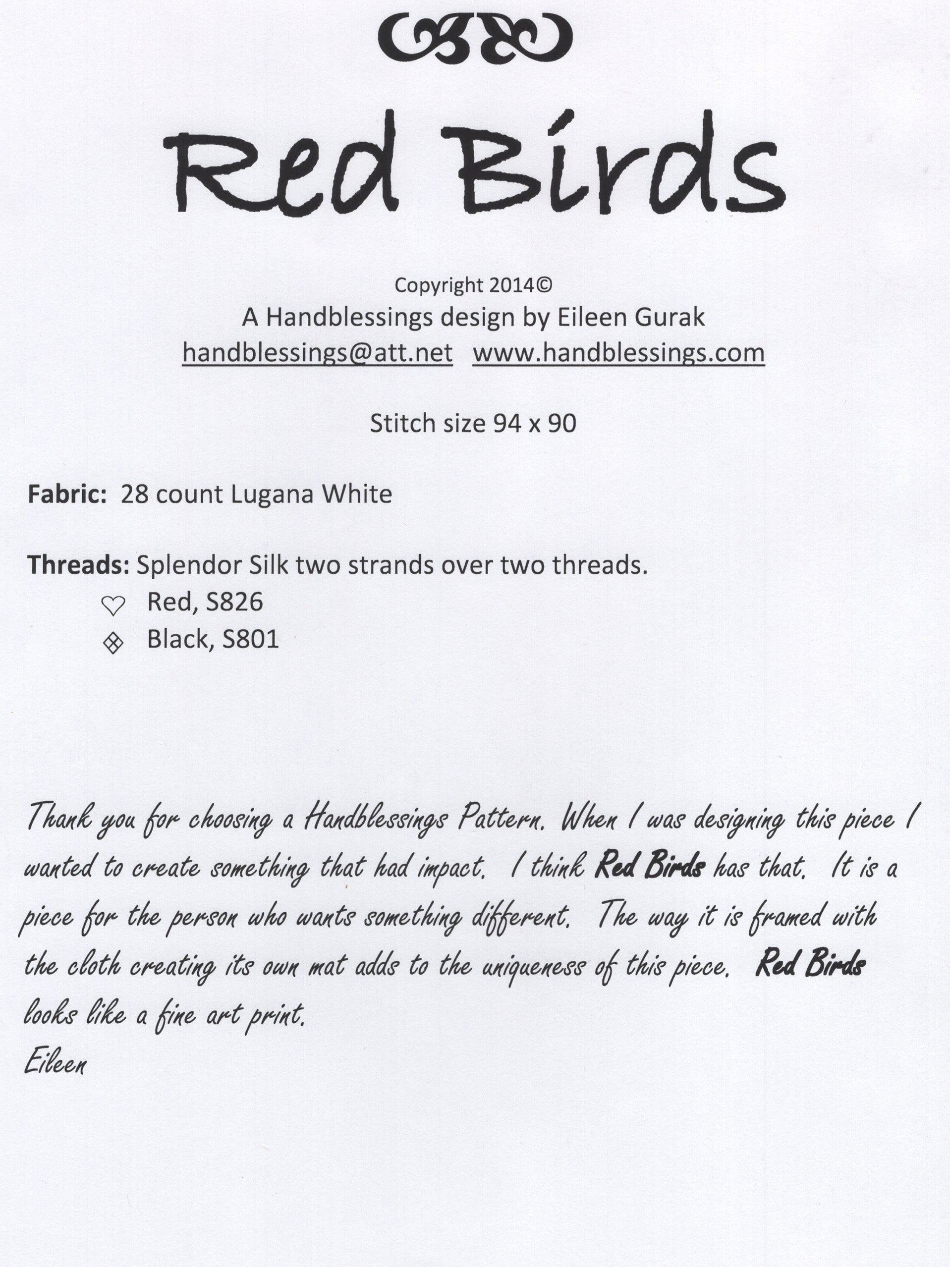 Handblessings' Red Birds was designed by Eileen Gurak.  The model was stitched on 28 count evenweave (2 strands over 2 threads).