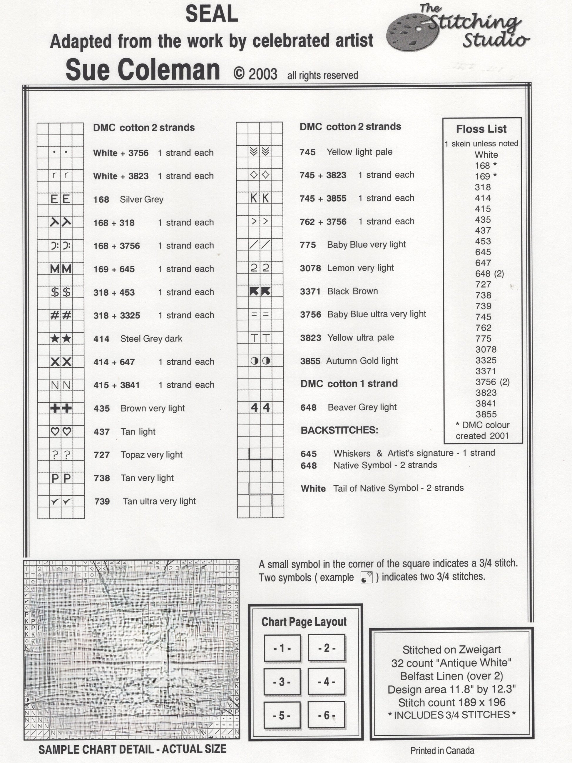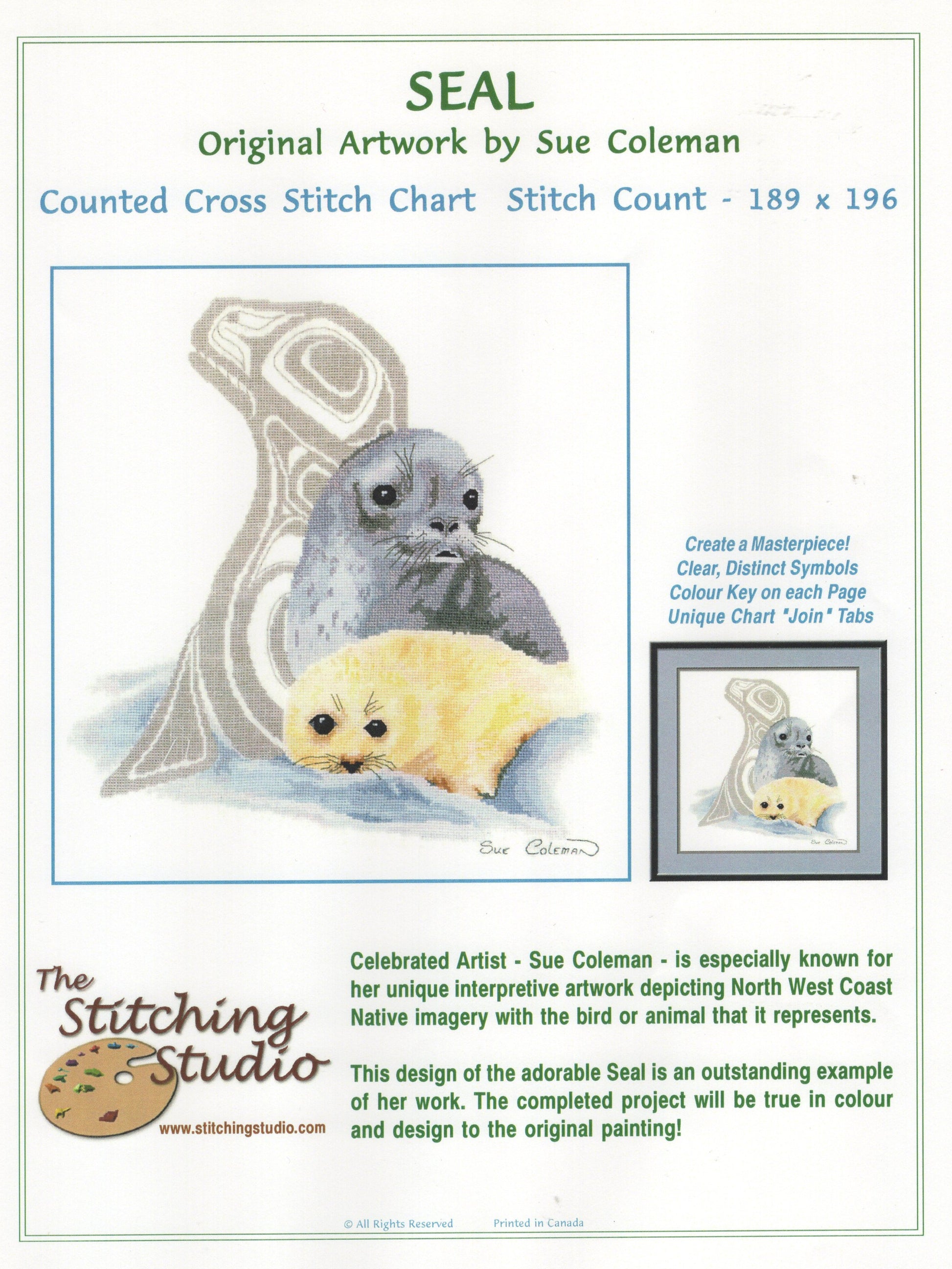 The Stitching Studio's Seal was adapted to cross stitch from an original painting by Sue Coleman.  The model was stitched on 32 count linen (2 strands over 2 threads)