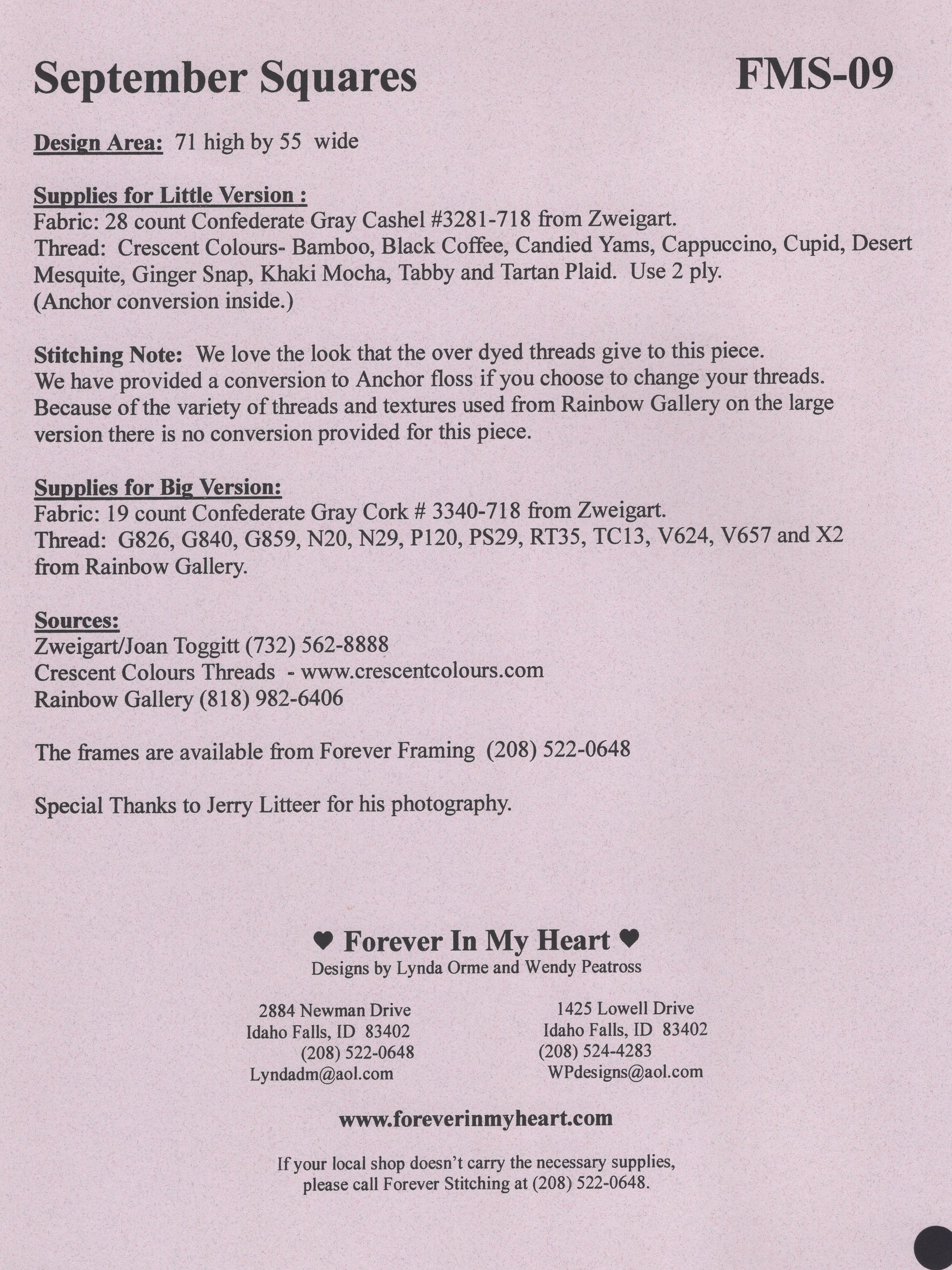 Forever In My Heart's September Squares was designed by Lynda Orme and Wendy Peatross. The model was stitched on 28 count evenweave (2 strands over 2 threads).