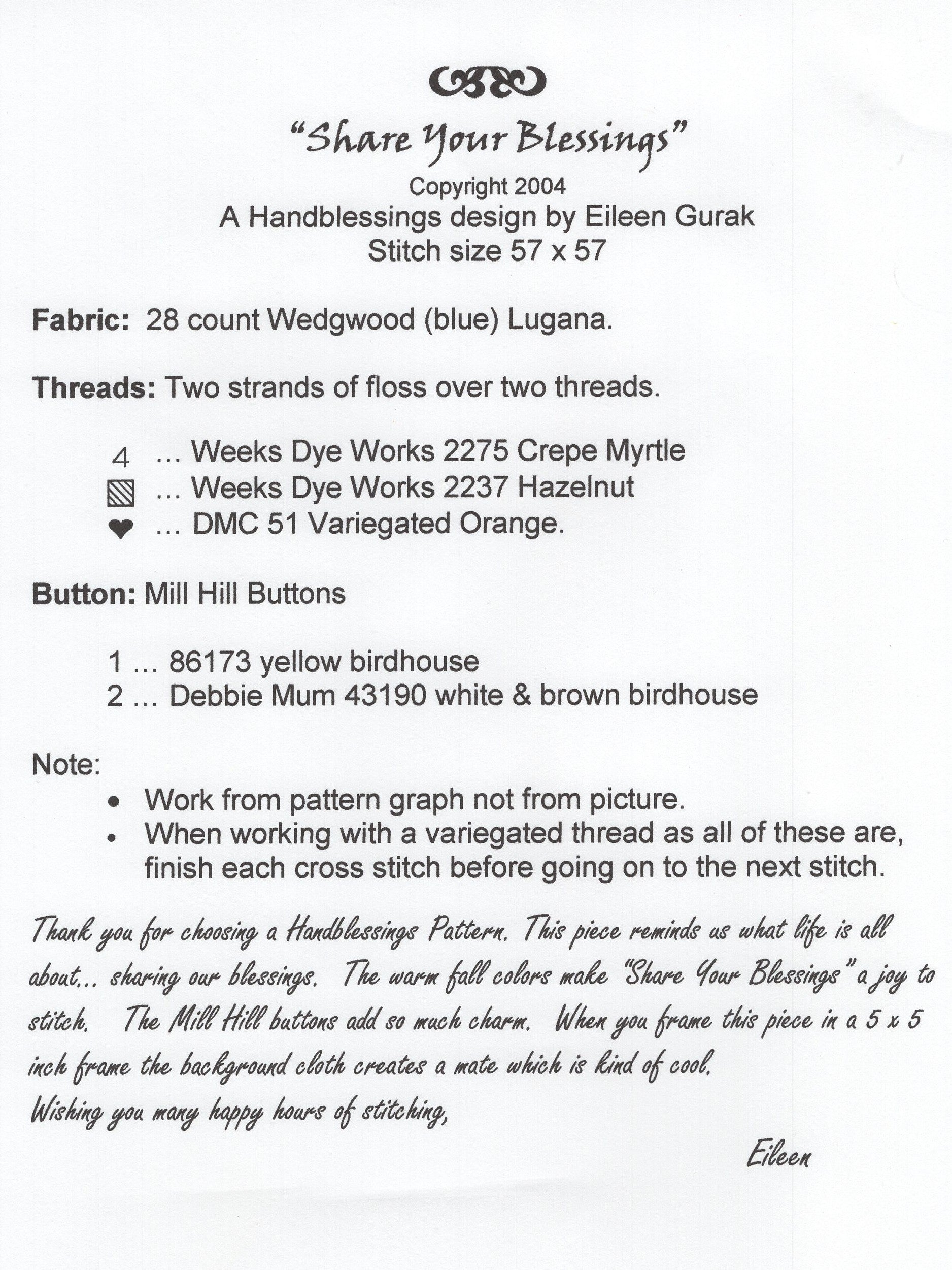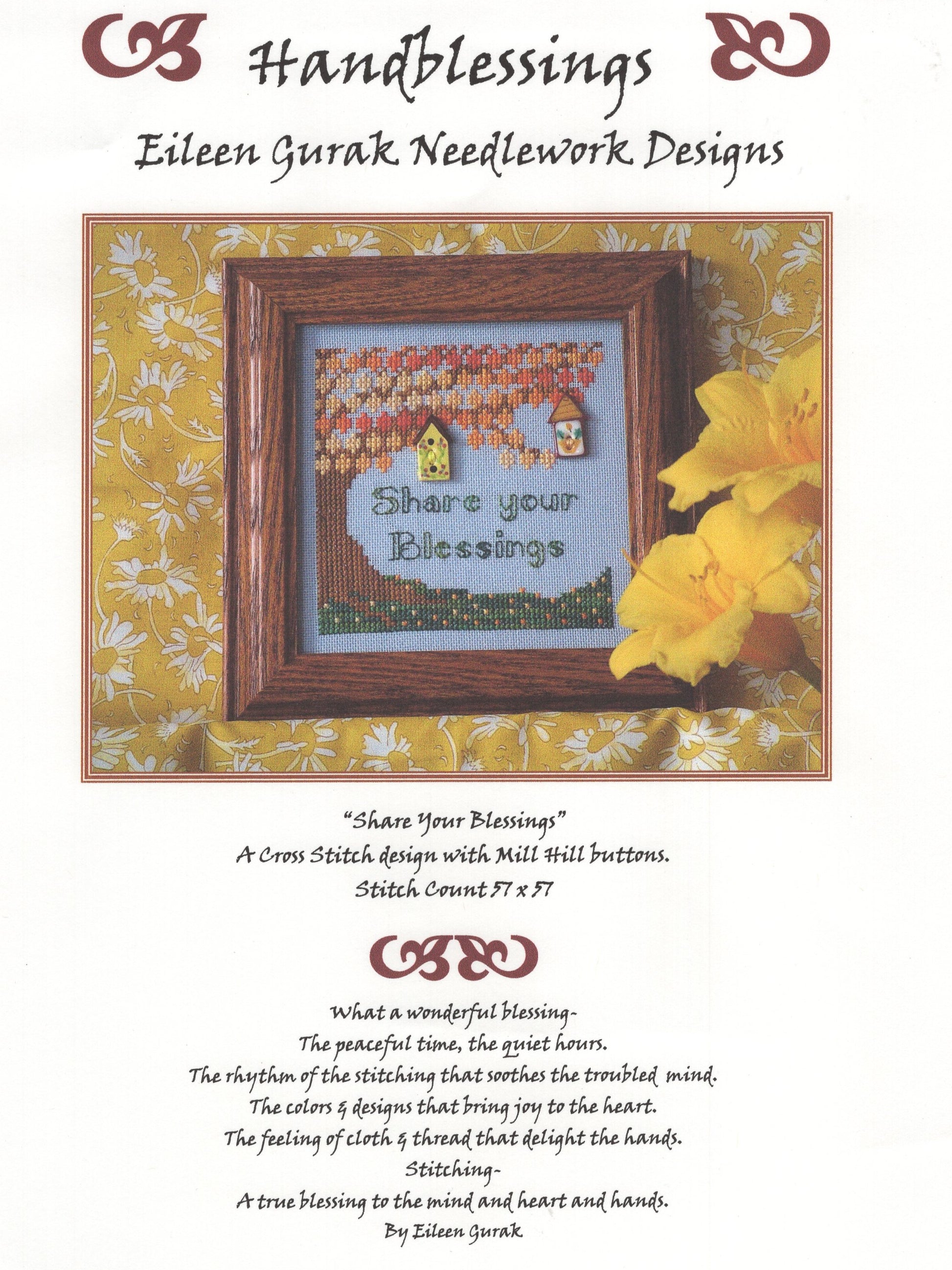 Handblessings' Share Your Blessings was designed by Eileen Gurak.  The model was stitched on 28 count evenweave (2 strands over 2 threads).
