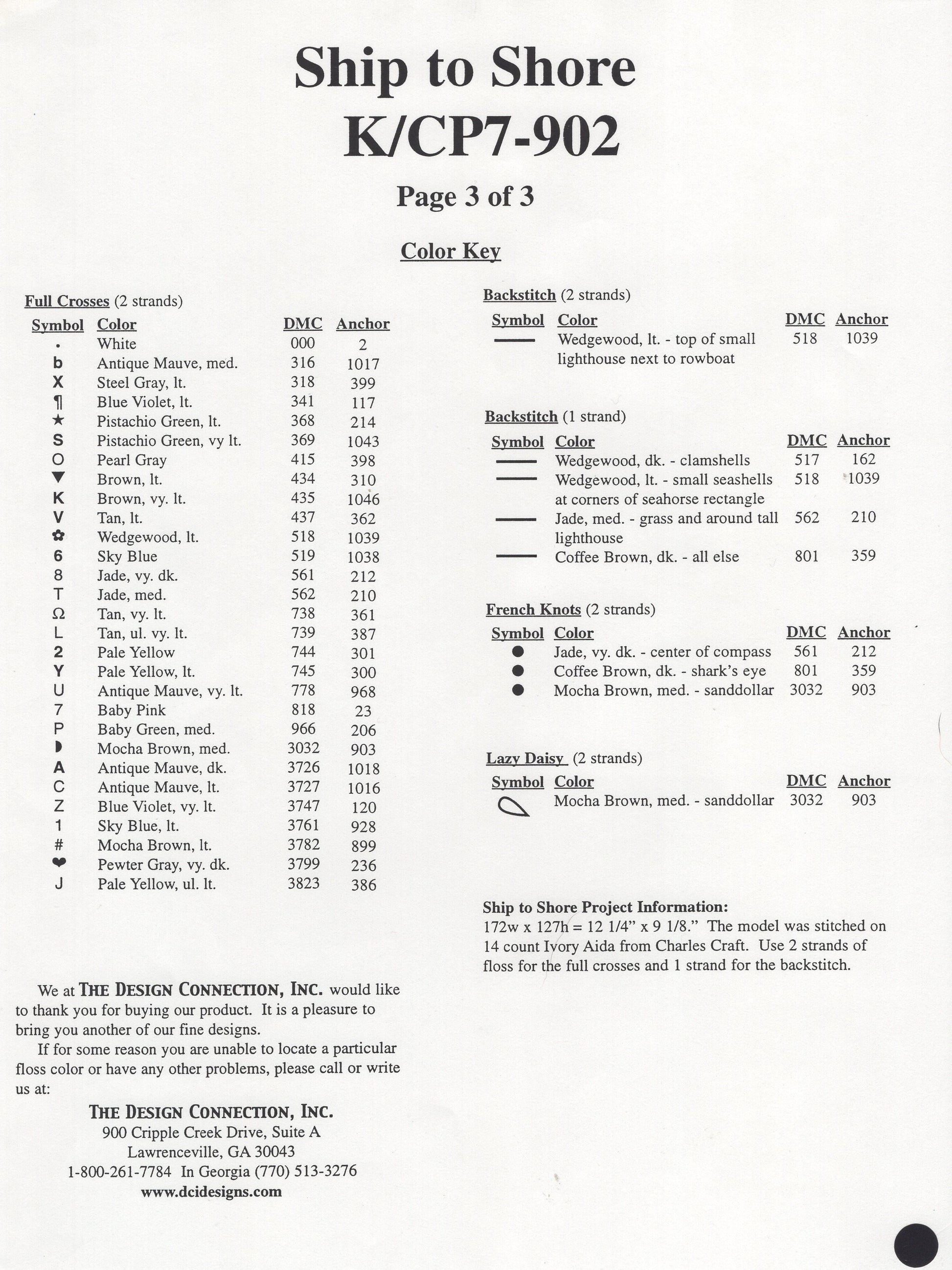 The Design Connection's, Ship To Shore was adapted to cross stich by Linda Bird from artwork by Jennifer DeCristoforo.  The model was stitched on 14 count Aida (2 strands over 2 threads).