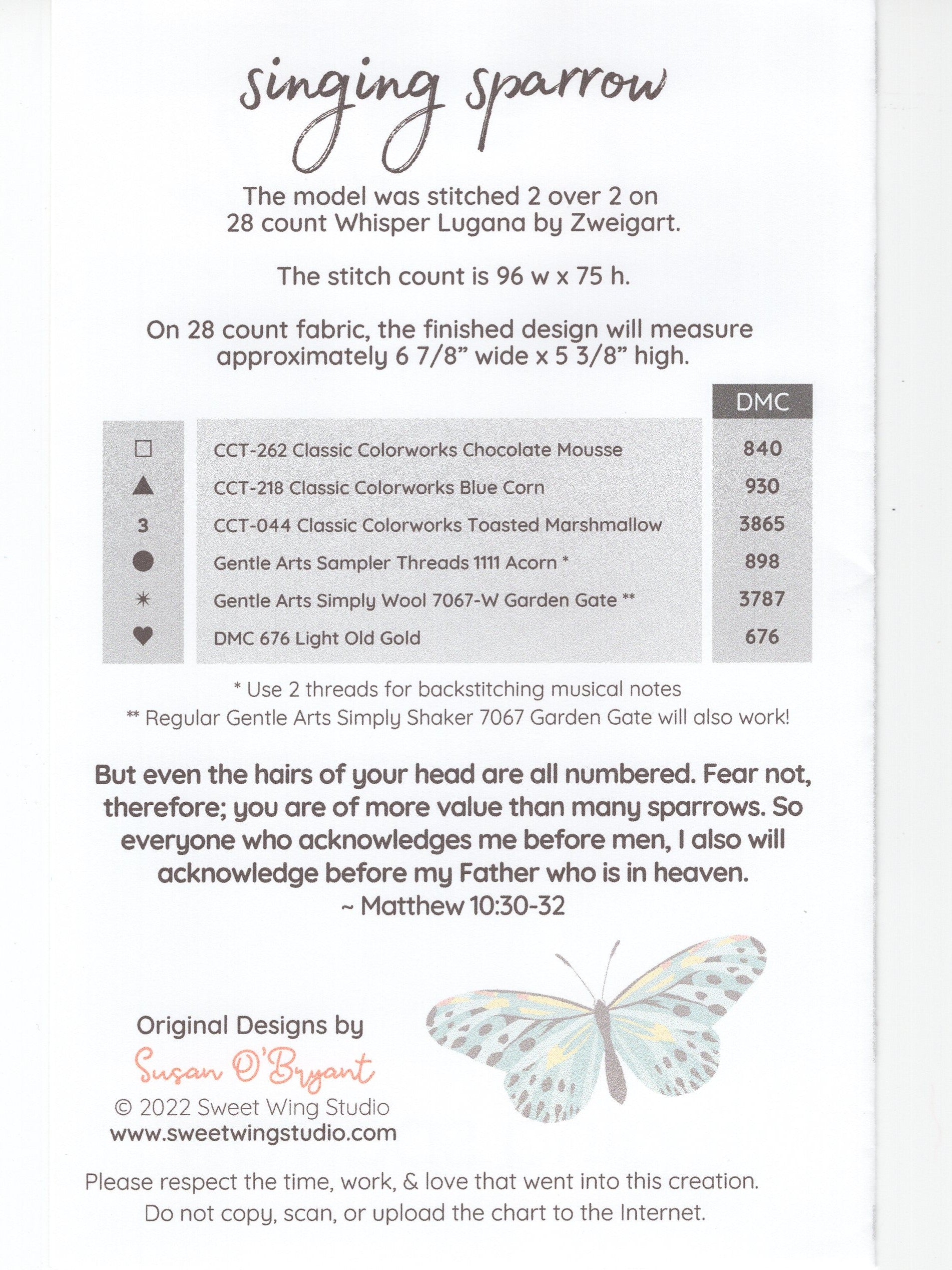 Sweet Wing Studio's Singing Sparrow was designed by Susan O'Bryant.  The model was stitched on 28 count evenweave (2 strands over 2 threads)