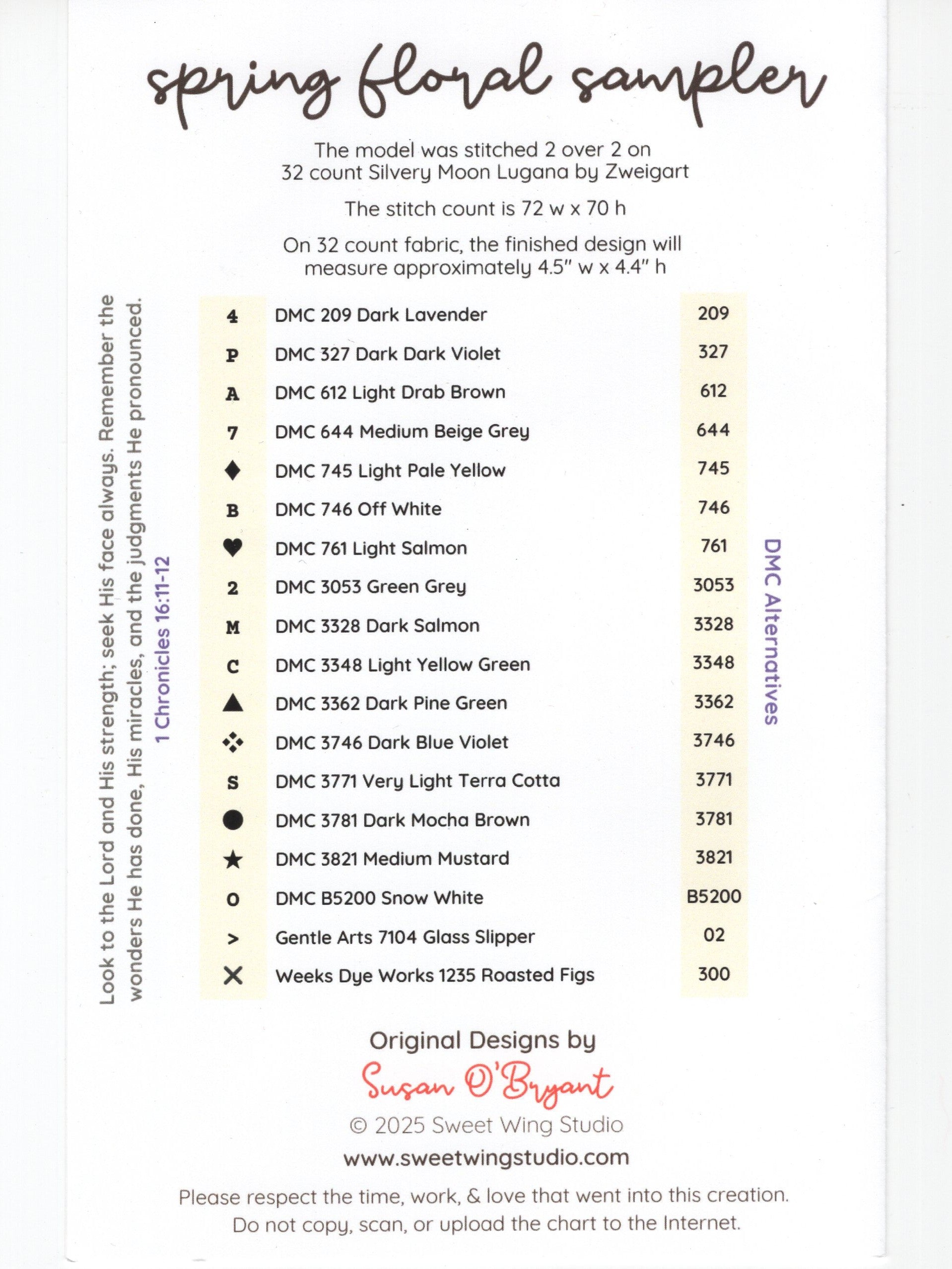 Sweet Wing Studio's Spring Floral Sampler was designed by Susan O'Bryant.  The model was stitched on 32 count evenweave (2 strands over 2 threads)