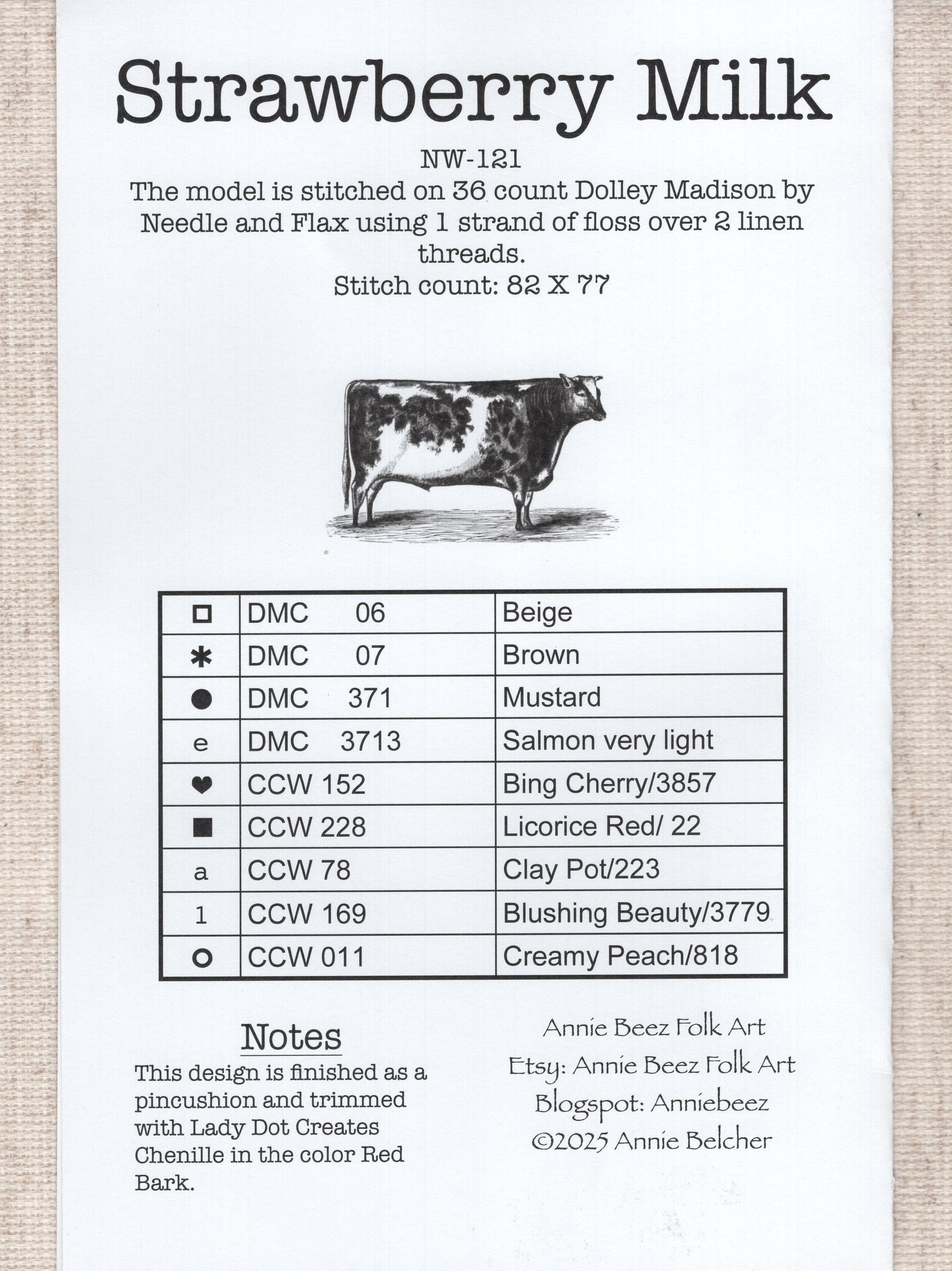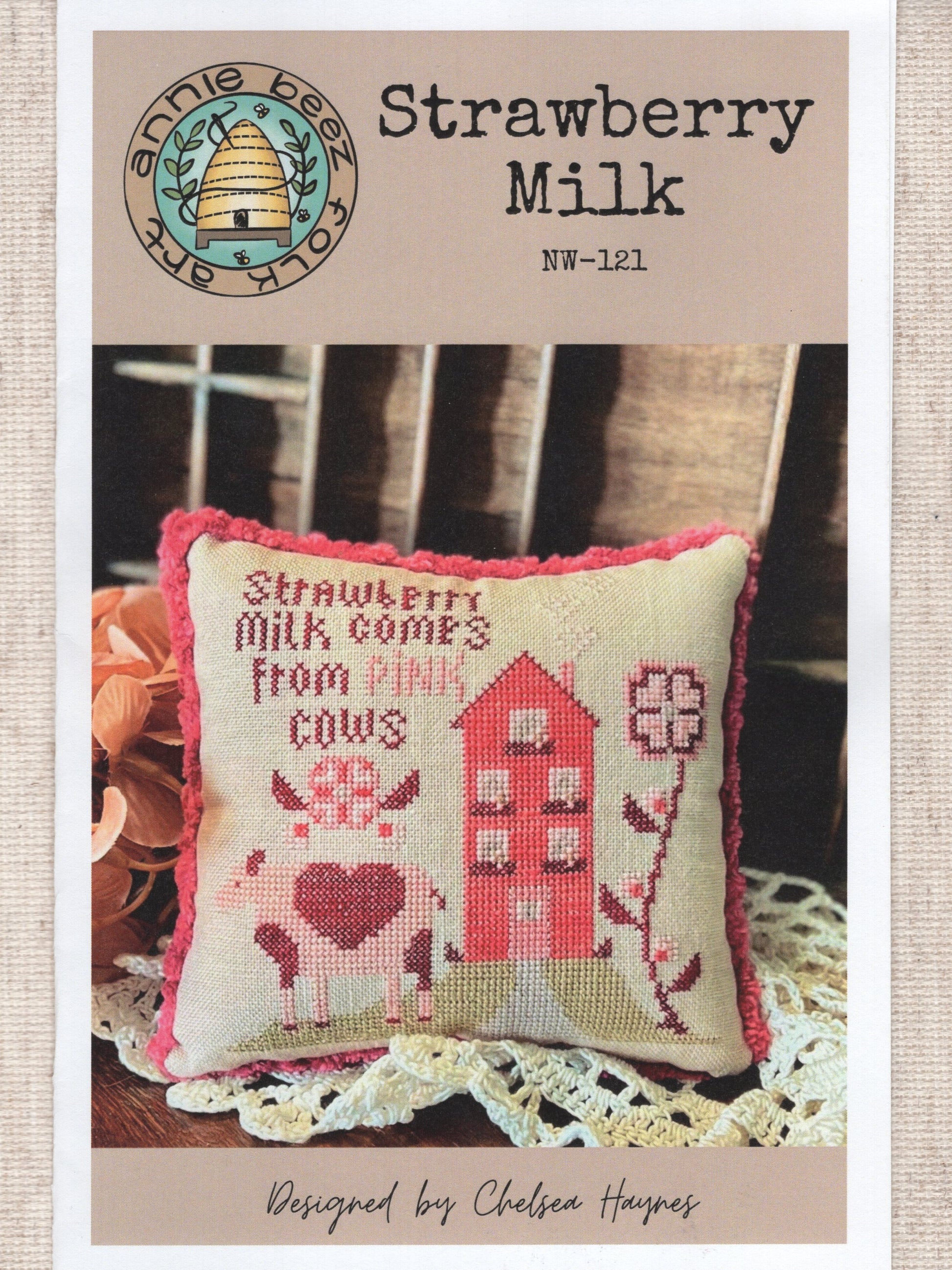 Annie Beez Folk Art's Strawberry Milk pattern was designed by Chelsea Haynes.  The model was stitched on 36 count linen.