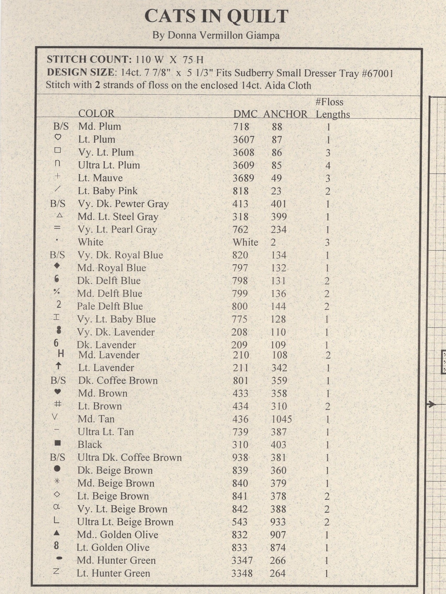 Sudberry House's Designer Series, Cat Family on Quilt was designed by Donna Vermillion Giamps.  The models was stitched on 14 count Aida (2 strands over 2 threads).