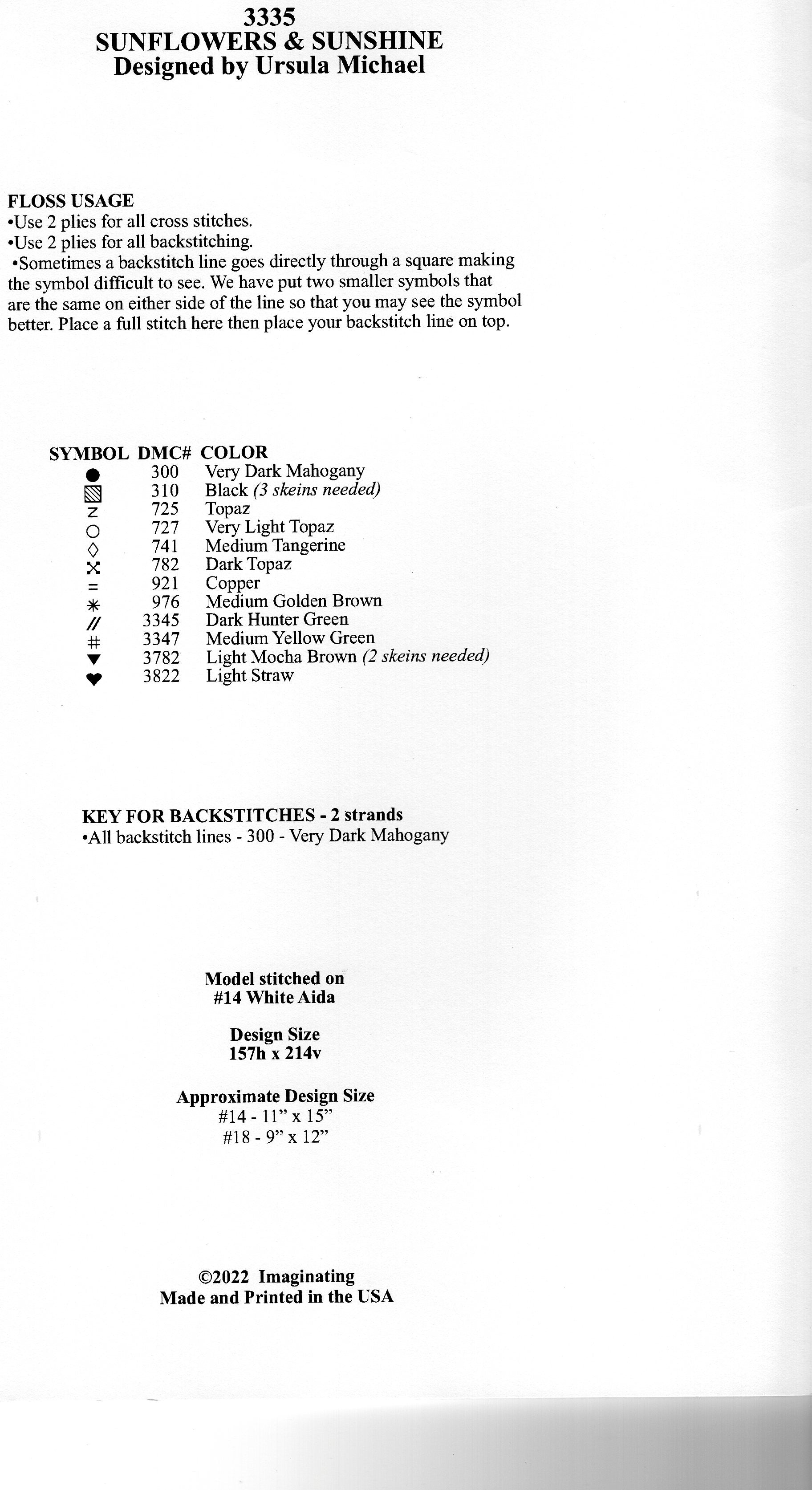 The model of Sunflowers & Sunshine by Imaginating was stitched on 14 count linen (2 threads over 1 strand).