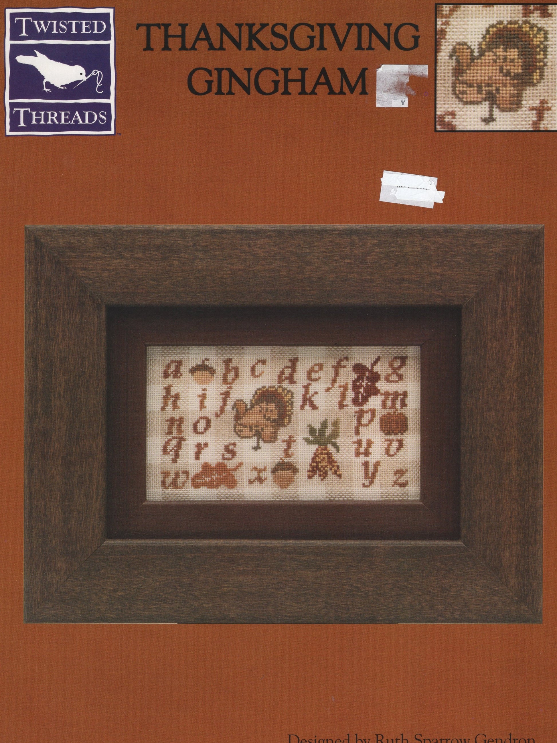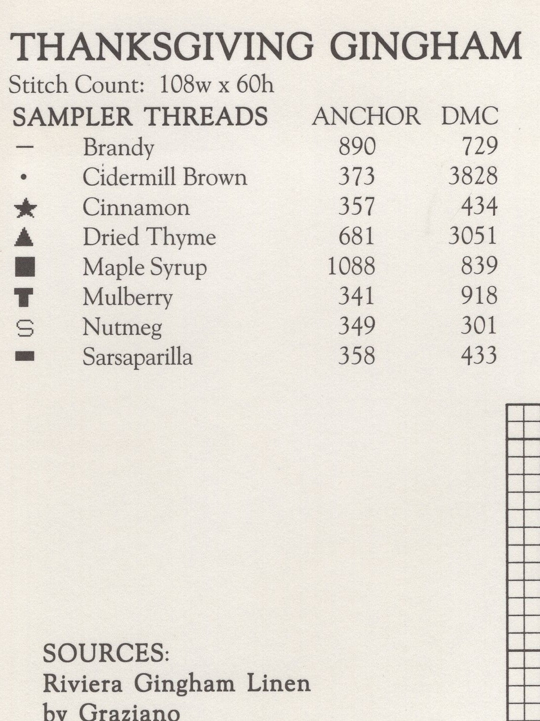 Twisted Threads’ Thanksgiving Gingham was designed by Ruth Sparrow Gendron.  The model was stitched on 28 count linen (1 strands over 1 threads).