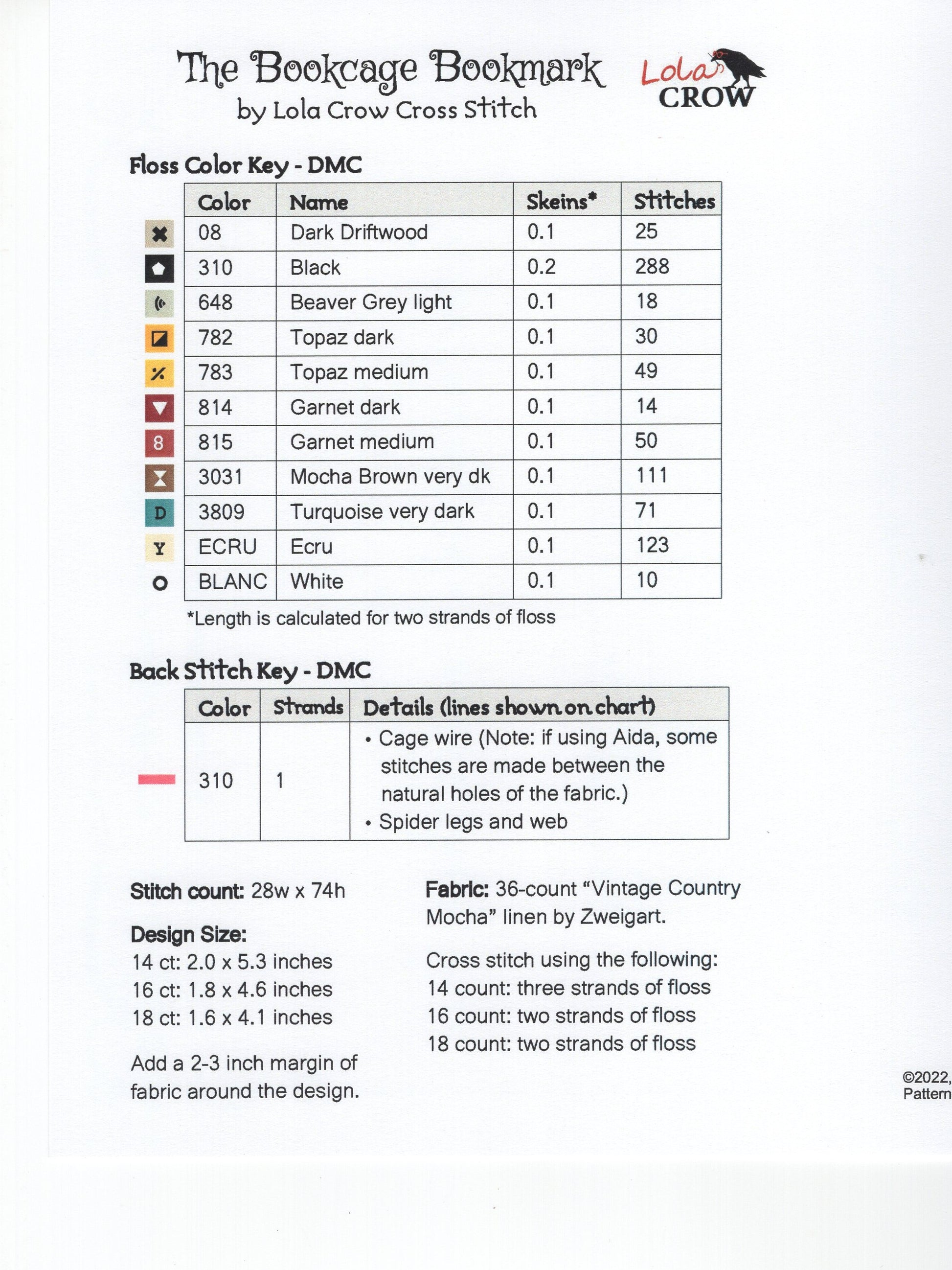 The model for Lola Crow's The Bookcage Bookmark was stitched on 36 count linen.