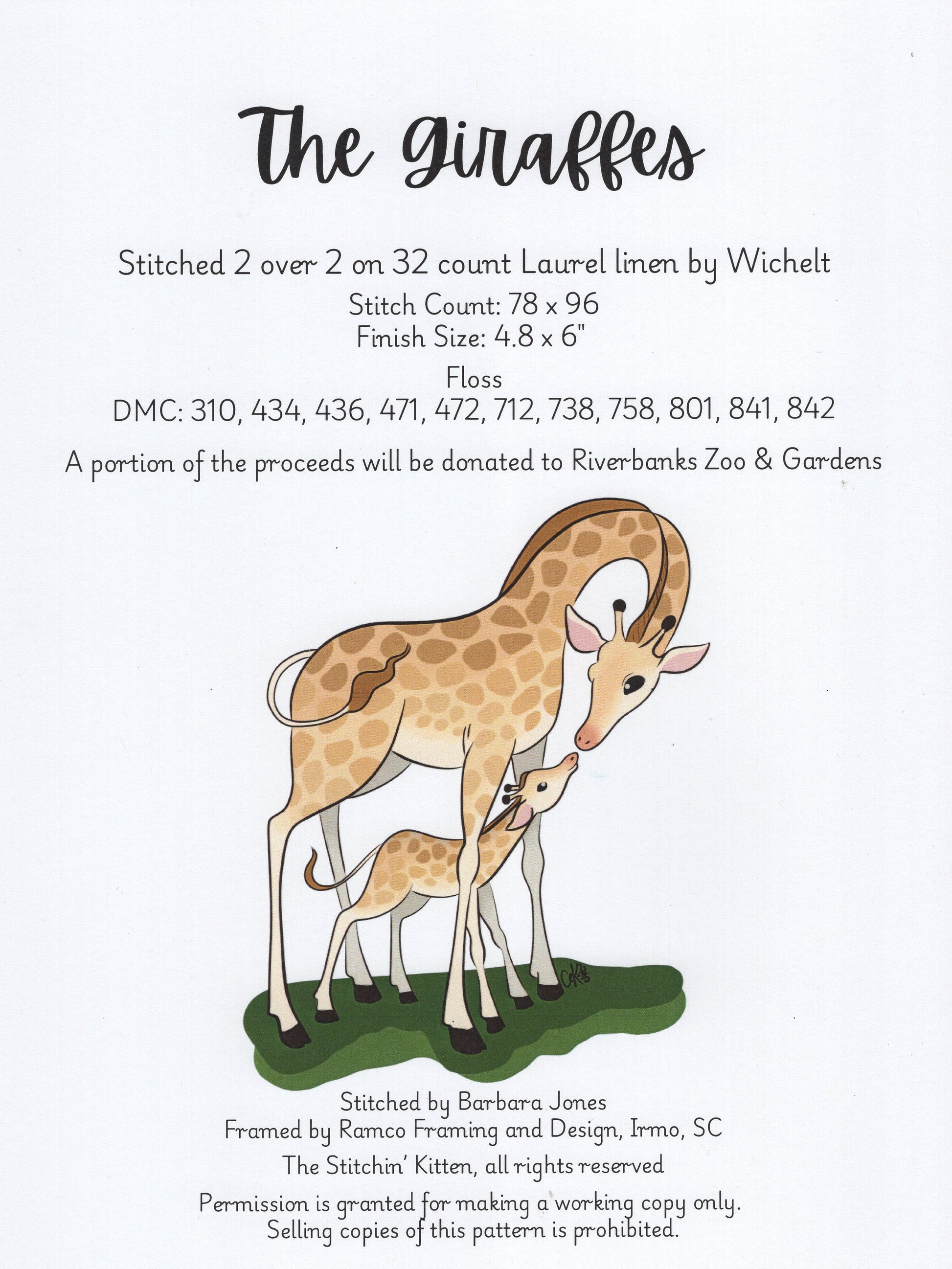 The Stitchin' Kitten Designs' pattern The Giraffes was designed by Caroline Davis Kelsey.  The model was stitched on 32 count linen (2 strands over 2 threads).