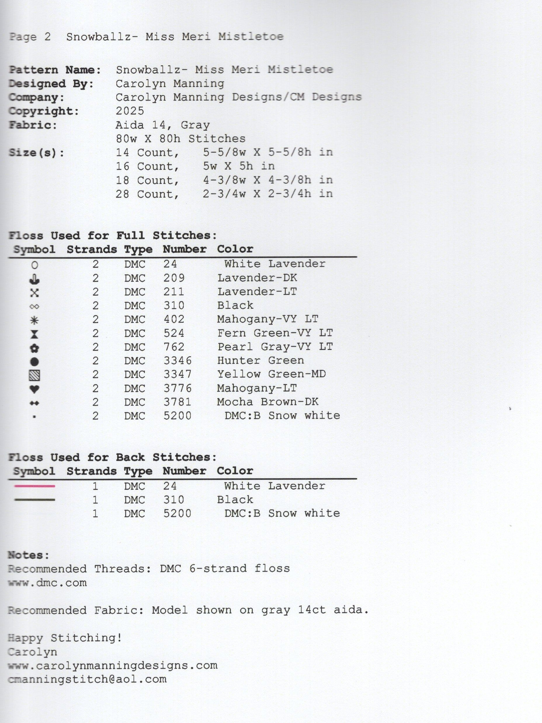 Carolyn Manning Designs' The Snowballz, Miss Meri Mistletoe was designed by Carolyn Manning.  The model was stitched on 14 count Aida