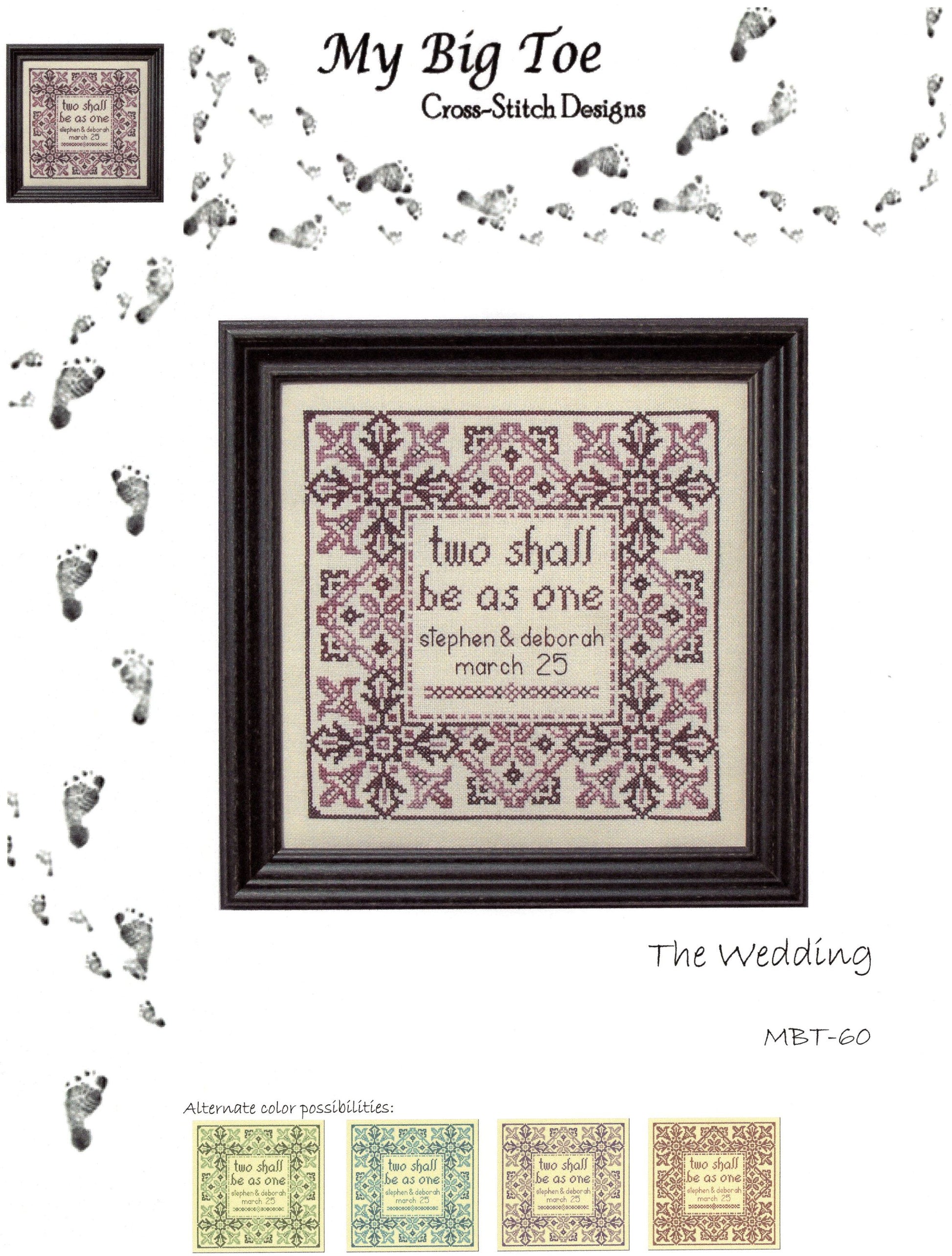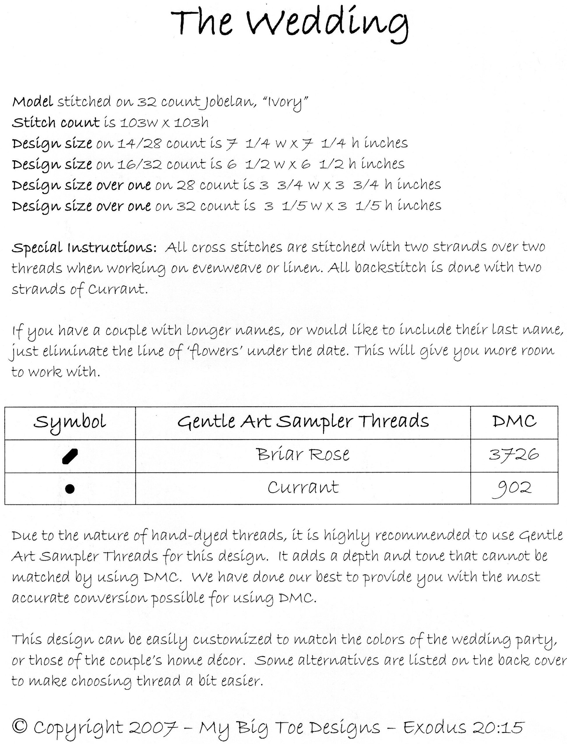 This pattern contains no fractional stitches, only a minimal amount of backstitching for couple's names and would be a good choice for a new stitcher.