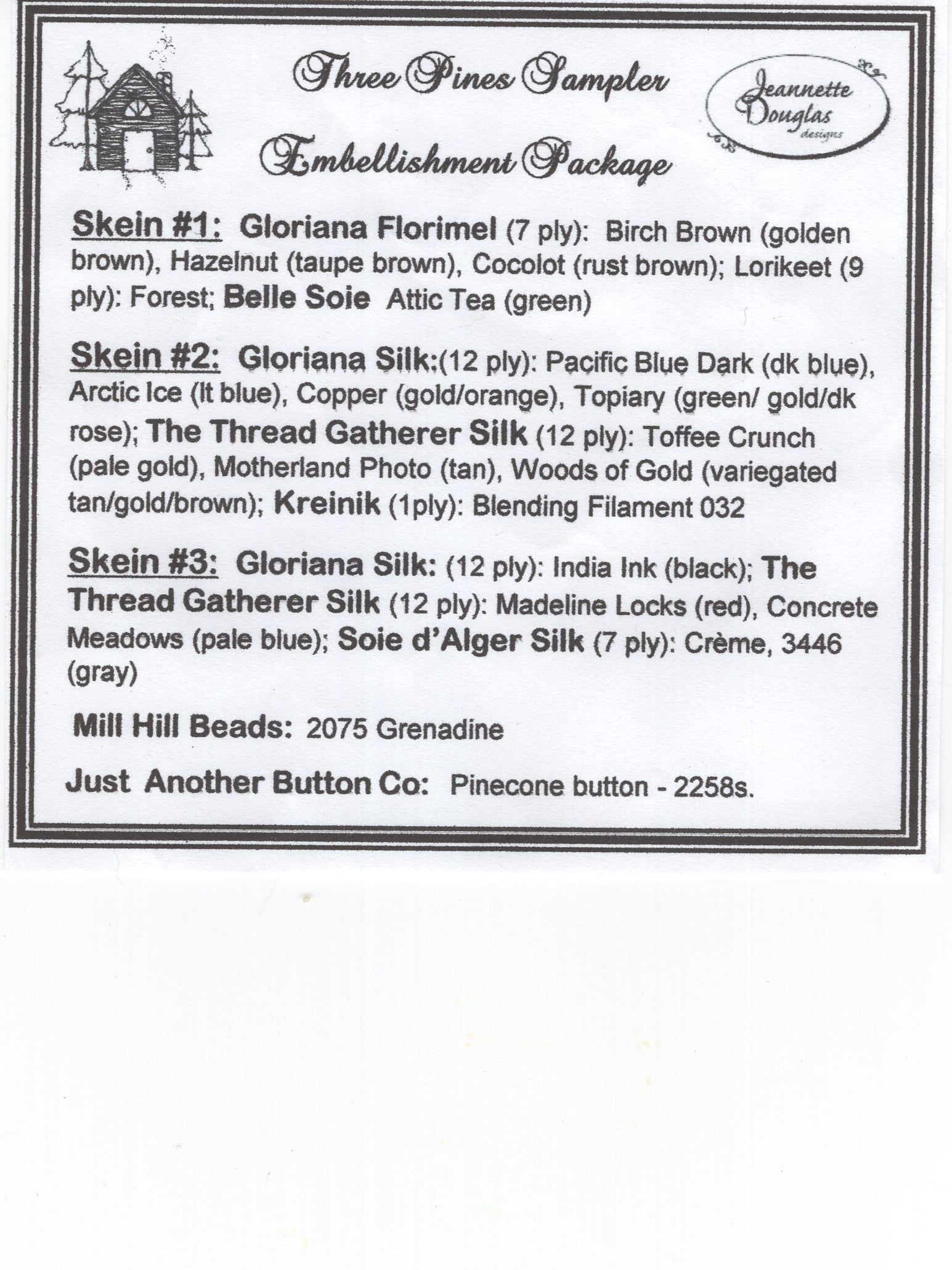Jeannette Douglas Designs' Three Pines Sampler was designed by Jeannette Douglas. The kit includes the pattern, fabric (32 count linen), floss and embellishments to complete the project. This kit uses all hand died floss and multiple specialty stitches. It's a challenge that will pay off with a beautiful project.