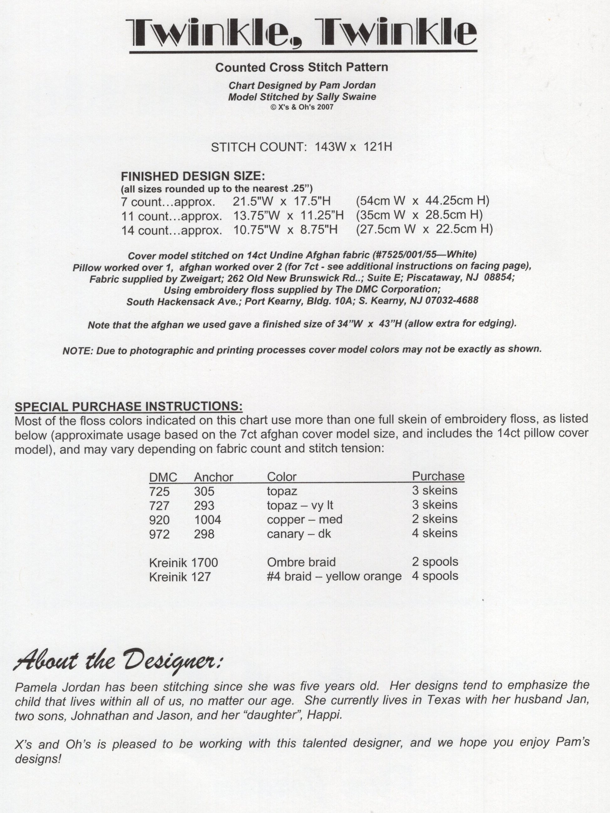 X's-and-Oh's Twinkle Twinkle was designed by Pam Jordan.  The model was stitch on 14 count Aida (2 strands over 2 threads).