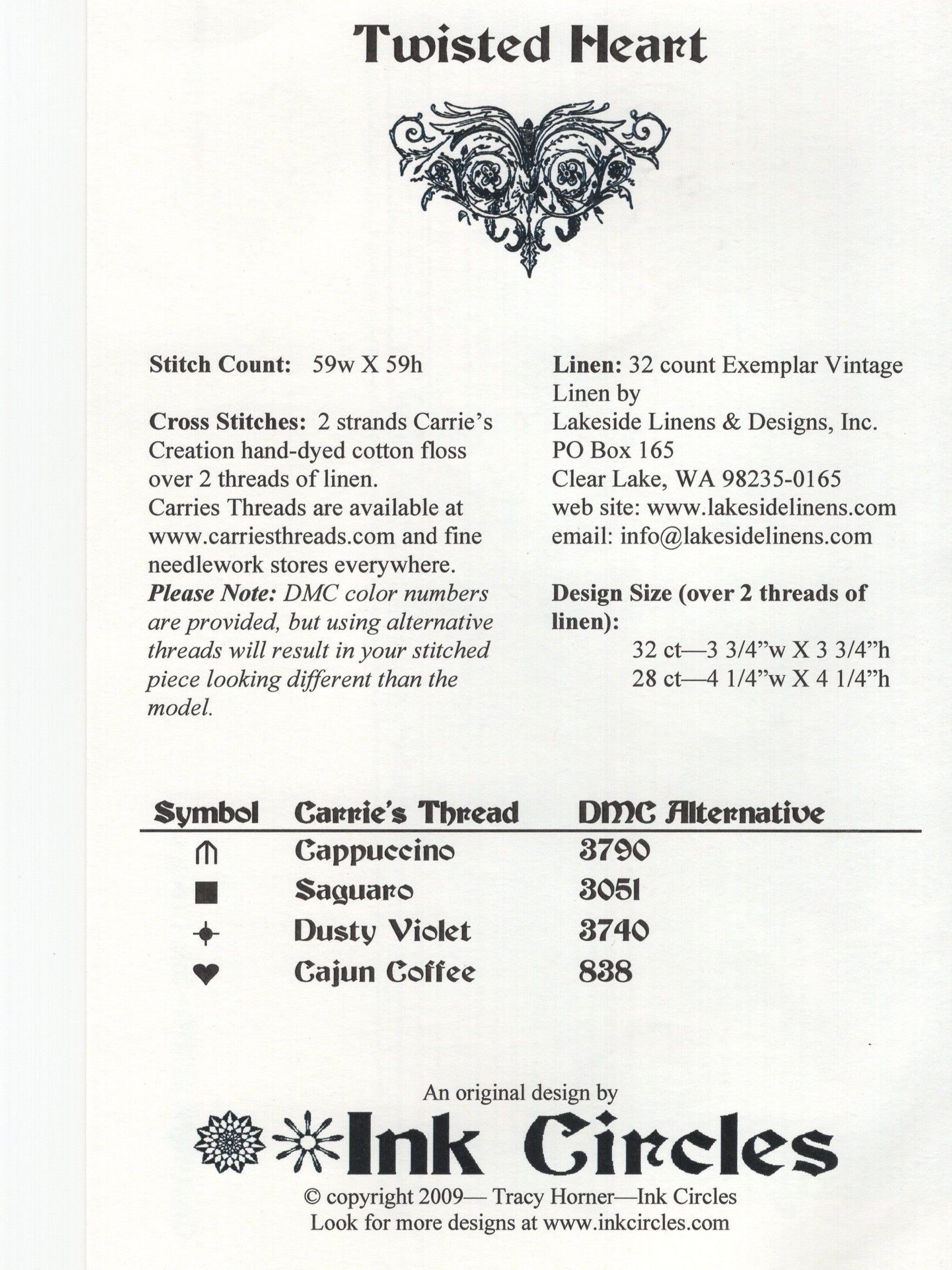 The model of Ink Circles' Twisted Heart was stitched on 32 count linen (2 strands over 2 threads).
