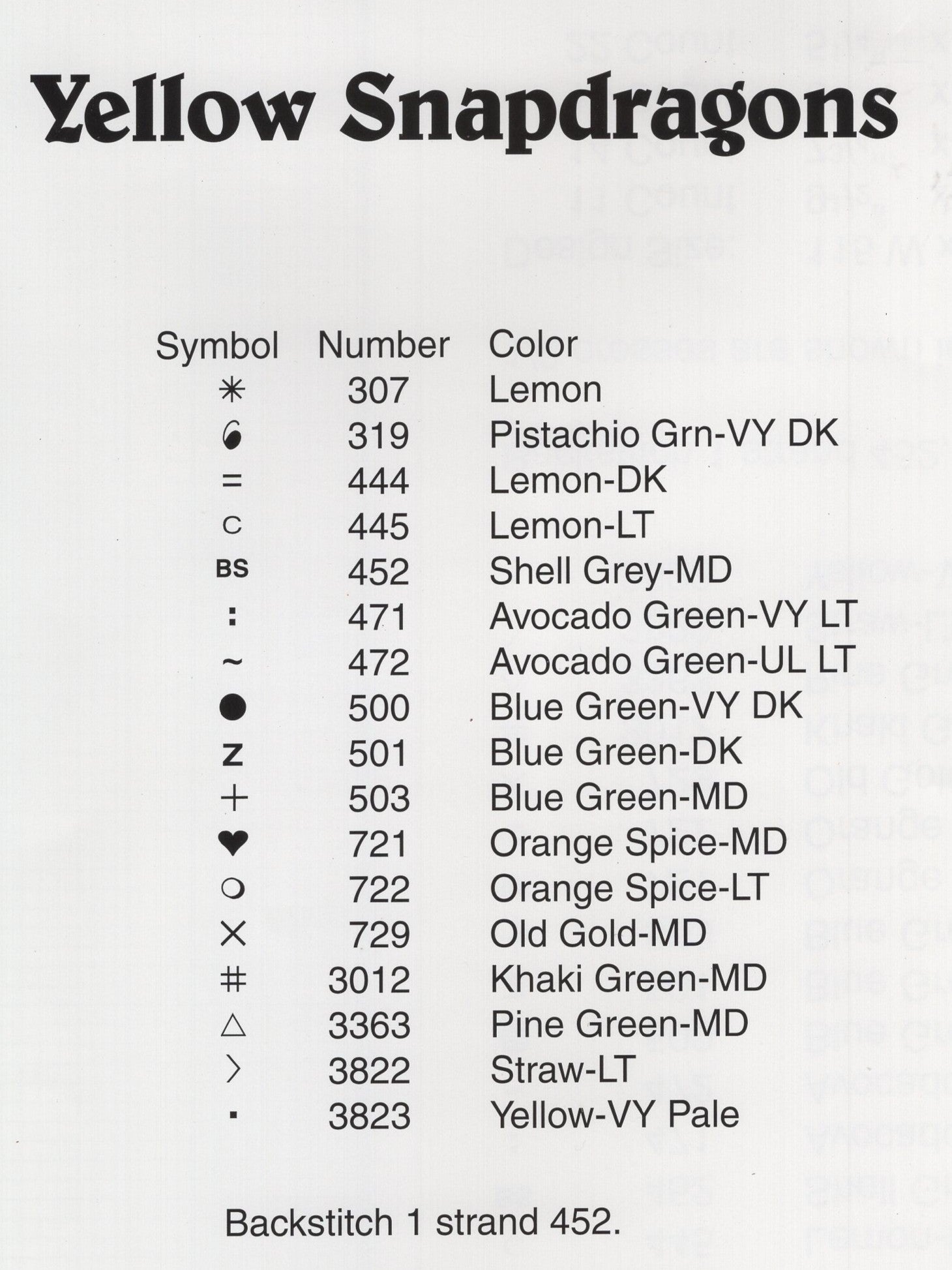 Green Apple's Yellow Snapdragons was adapted to cross stitch by Jeanne Bowers from a Mary Ann Reames watercolor.  The model was stitched on 32 count linen (2 strand over 2 thread).